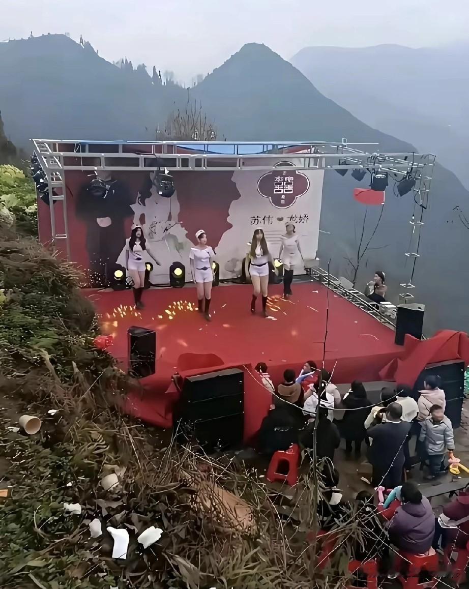 只要自己不尴尬,尴尬的就是别人。现在才理解这句话的含金量。 这个婚礼庆祝现场,大家说说可以打多少分,舞台直接搭建在半山腰疑似梯田上,两边都是斜坡。在舞台上数名穿着时尚的美女在跳舞💃,而台下都是一群阿姨、大妈、大爷在观看。 老年人会喜欢这种舞蹈吗? 再说,搭建这么一个大舞台,就不能找一个空旷一点的地方举行?