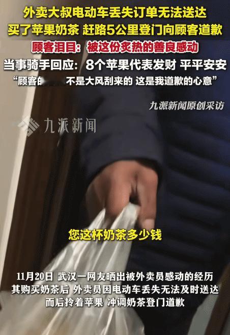 感动!湖北武汉,外卖大叔的电瓶车丢失,导致订单无法送达。没想到,他买了8个苹果和奶茶,赶路5公里登门向顾客道歉。他真诚地跟顾客说: “代表平平安安发大财,我知道你也不缺这点,但是我心在这里,我赶了5.6公里赶过来的……”顾客: 被这份炙热的善良感动。网友: 车子还没找到就去道谢,这是真诚遇到善良了。 而后来这位顾客把这段感动的经历晒了出来,获得众多网友点赞。原来,这位外卖大叔叫赵敬国,今年50岁,之前在老家打零工、摆地摊、当保安,在工地上也干过。他听朋友说,武汉这边跑外卖还不错,他就来武汉跑外卖了,但是刚跑两个月时间,对于武汉的路还是很熟,所以跑得多。这天晚上,他取了一个奶茶订单,正准备去送,结果却发现电瓶车丢了。 而电瓶车是他最近新买的,还使用的是租借的电池,于是他找边找电瓶车,还向顾客道歉。他给顾客打电话说: “您这杯奶茶多少钱?我赔给你,因为我无法给您送到家里去,我现在车子丢了,我现在正在找车呢!”顾客这边得知他的情况后,就安慰他,告诉他不用赔钱,奶茶请他喝了,但是他告诉顾客,这个钱要赔。 后来他没找到车,却买了8个苹果和一排冲调奶茶赶了5公里到顾客家给顾客道歉。 他手提赔礼在门口向顾客解释:“八个苹果代表平平安安发大财的,我做骑手的,相当缺钱,我也知道,你不缺这一点,但我的心意在这里,我赶了5.6公里赶过来的。” 顾客问他: “你的车呢?”他说: “车还没有找到。” 后来平台奖励了赵敬国2000块钱,还给他安排了一辆全新的电瓶车,而他的电瓶车也找到了。 当他看到火的视频后,他除了感动,他还说: “我对于社会对我的评价很意外,因为我只是做了个骑手应该做的事,所有人的钱都不是大风刮来的。我送一单的钱不多,顾客的钱也是钱,我是带着道歉的心去买的苹果和奶茶。” 对此有网友说: 我也遇到过一次,下雨天骑手着急送货,不小心摔了,其中一点东西坏了,一定要多赔,还一直道歉,我宽慰他其实没关系,都不容易,如果一定多赔我就不要了,最后他妥协了。 也有网友说: 我以前送外卖,把可乐洒了,我说赔给人家,那个小哥哥说不用了,好人有好报! 还有网友说: 大冷天的,看的心里暖暖的,善良遇到了善良。 外卖大叔赵敬国在电瓶车丢失后,他没有抱怨,没有推诿,找车时,还给顾客打电话解释,主动赔偿,而顾客也是一个善良的人,理解,并还把奶茶送给他喝。 他正是因为顾客理解而感动,于是买了8个苹果和奶茶,赶了5公里多路,亲自登门向顾客道歉。而他那句朴素的“代表平平安安发大财”,笨拙而真诚,戳中了无数人的心。他本可以等待平台处理,但是他选择用行动守护自己的承诺与尊严。 最让人动容的是,这份厚重的歉意,发生在他自己正身处困境之时。车还没找到,生计工具没了,他却第一时间想着不能辜负顾客的等待。这份在风雨中依然坚守的善良,我觉得比顺境中的善意更加珍贵。 顾客的感动与理解,网友的赞美与共情,以及平台温暖关怀,共同完成了这个温暖的故事。 这不是简单的服务与被服务的关系,而是两个善良灵魂的相遇。他送出的不只是苹果和奶茶,更是是一份沉甸甸的真心。 顾客收下的也不只是歉意,是对平凡人高贵品格最深的敬意。 所以,生活不易,但总有人在缝补这个世界。 这位大叔用他的行动告诉我们,无论身处何种境遇,守住心中的“诚”与“善”,便是最体面的生活姿态。为这份赤诚点赞,愿他能接到更多单子,愿所有善良都不被辜负。 (来源: 九派新闻)