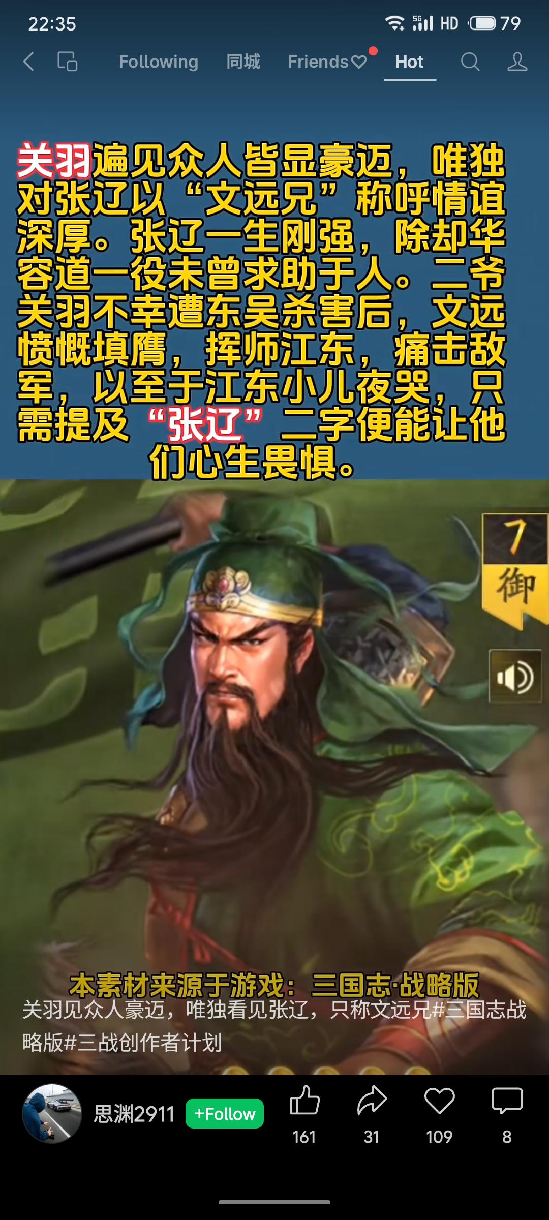 关羽与众将相处豪迈,唯独对张辽敬称“文远兄”,情谊深厚。张辽一生刚强,仅华容道求过关羽。关羽遇害后,张辽悲愤伐吴,杀得江东闻其名而止小儿夜啼。