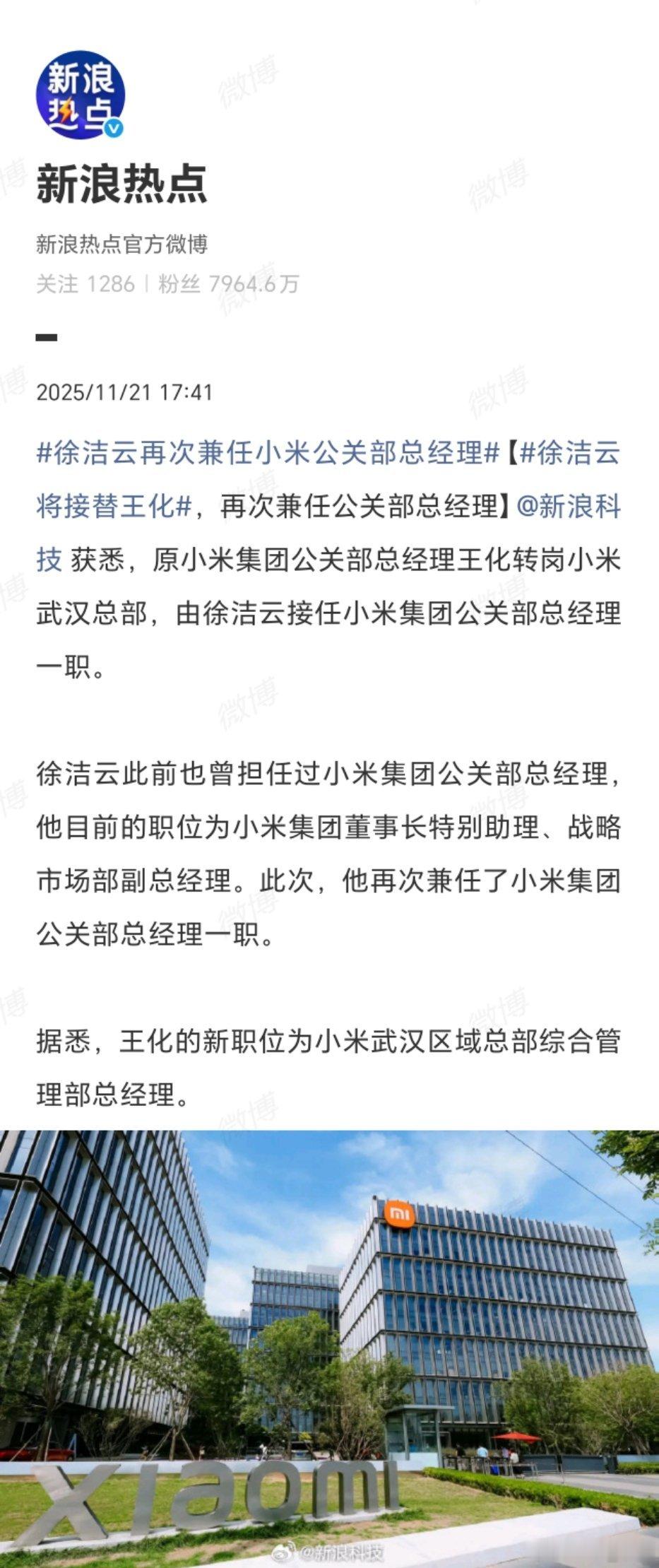 小米公关换帅!王化赴武汉总部任职,徐洁云身兼战略市场副总和董事长助理,再接手公关部工作。