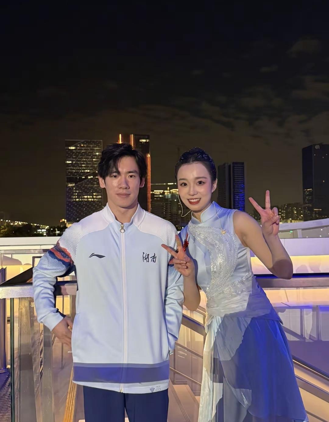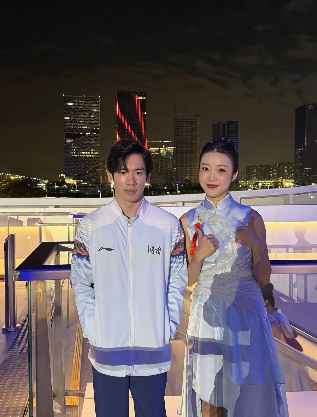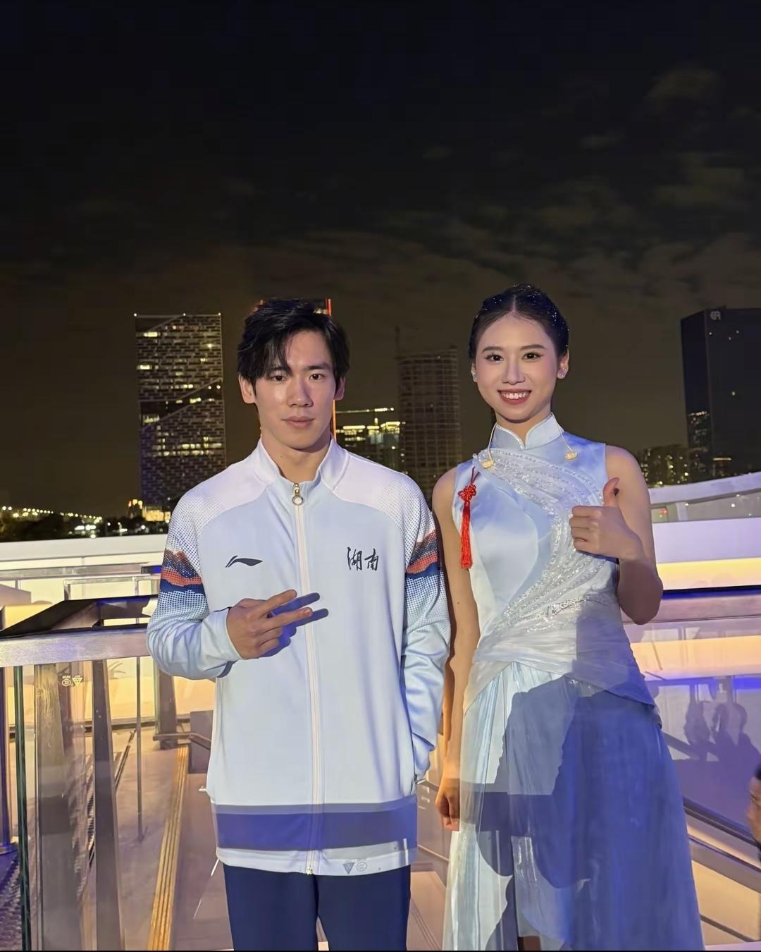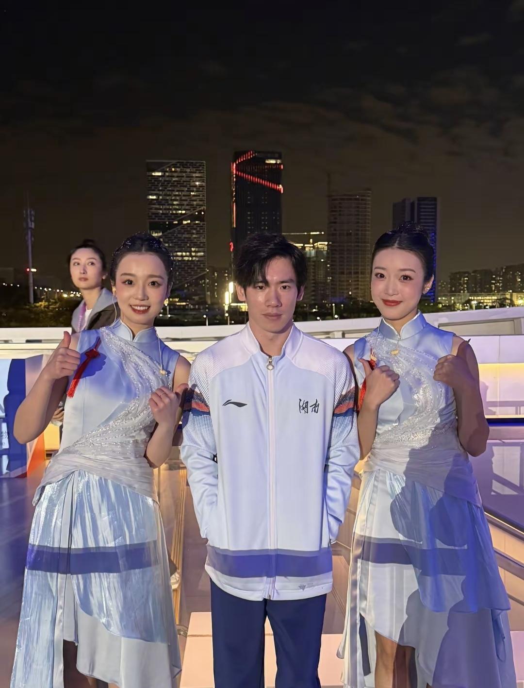 11月21日晚上,在深圳,优秀运动员们聚集在这里,张博恒在美丽的夜色中,与志愿者小姐姐们合影了。 张博恒穿着湖南代表队的运动服,帅气的发型看起来很文艺,有两位穿着礼服裙子的志愿者与张博恒合影了,两位女志愿者穿上礼服尽显东方之美,很有气质。 张博恒拍照的时候特别内敛,刚开始两只手放在口袋里,后来用手简单的比划了一个姿势,有点害羞的样子,可能是站在身边的两位小姐姐太优秀、太漂亮了。