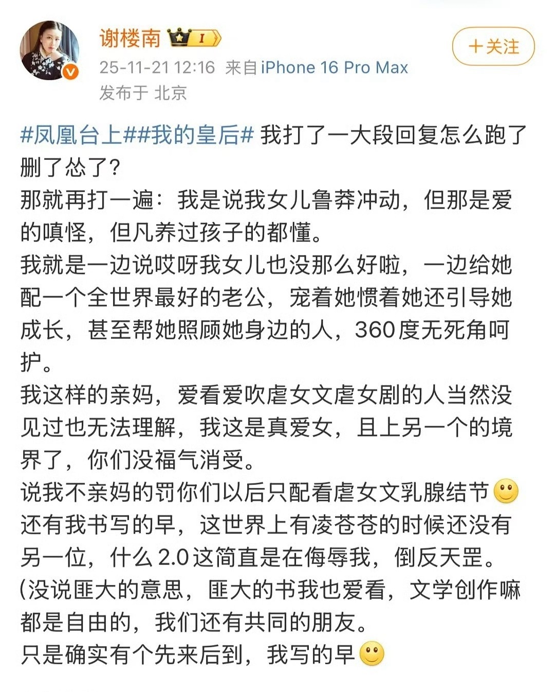 彭小苒硬刚凤凰台上的原作者,维护自己的作品起因于网友吐槽作者虐女,然后作者发数篇微博声嘶力竭地声讨自己的书和女主被改得七零八落