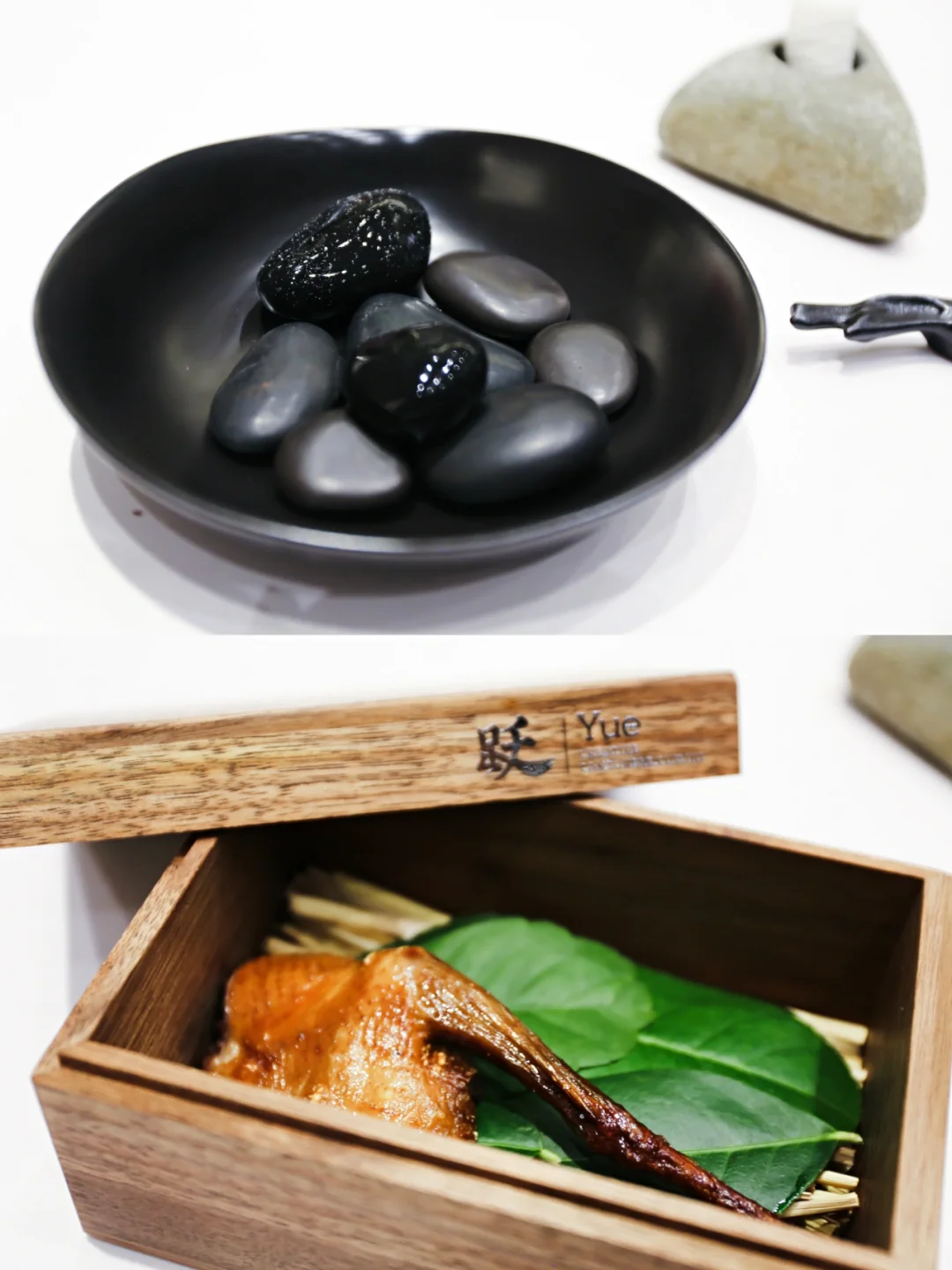 当服务员端上一份石头时,我有点诧异,为什么有两颗石头长得有点不一样。原来它们才是这道菜的主角:广东人熟悉的凤爪去骨加入青柠檬和小辣椒,做成微酸微辣的东南亚风味的凤爪冻,再加入墨鱼汁使其颜色和外观很有趣味性。