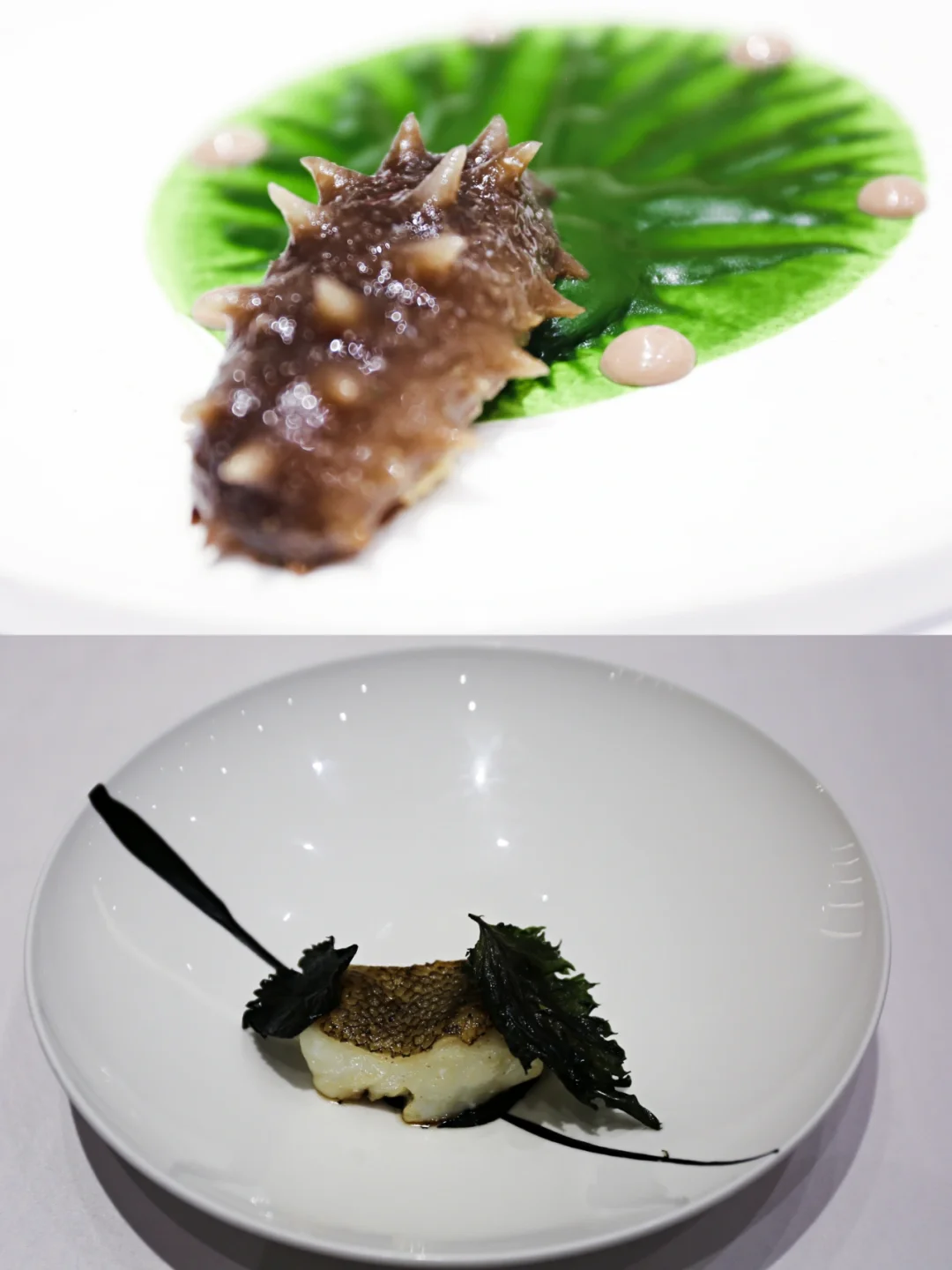 关东海参配合虾酱和护国菜让这道菜的味觉和造型都独具特色。海参内加入了大黄鱼子和海胆,让口感变得更丰富而多层次,而虾酱的香味让嗅觉也能参与到这道菜的体验。