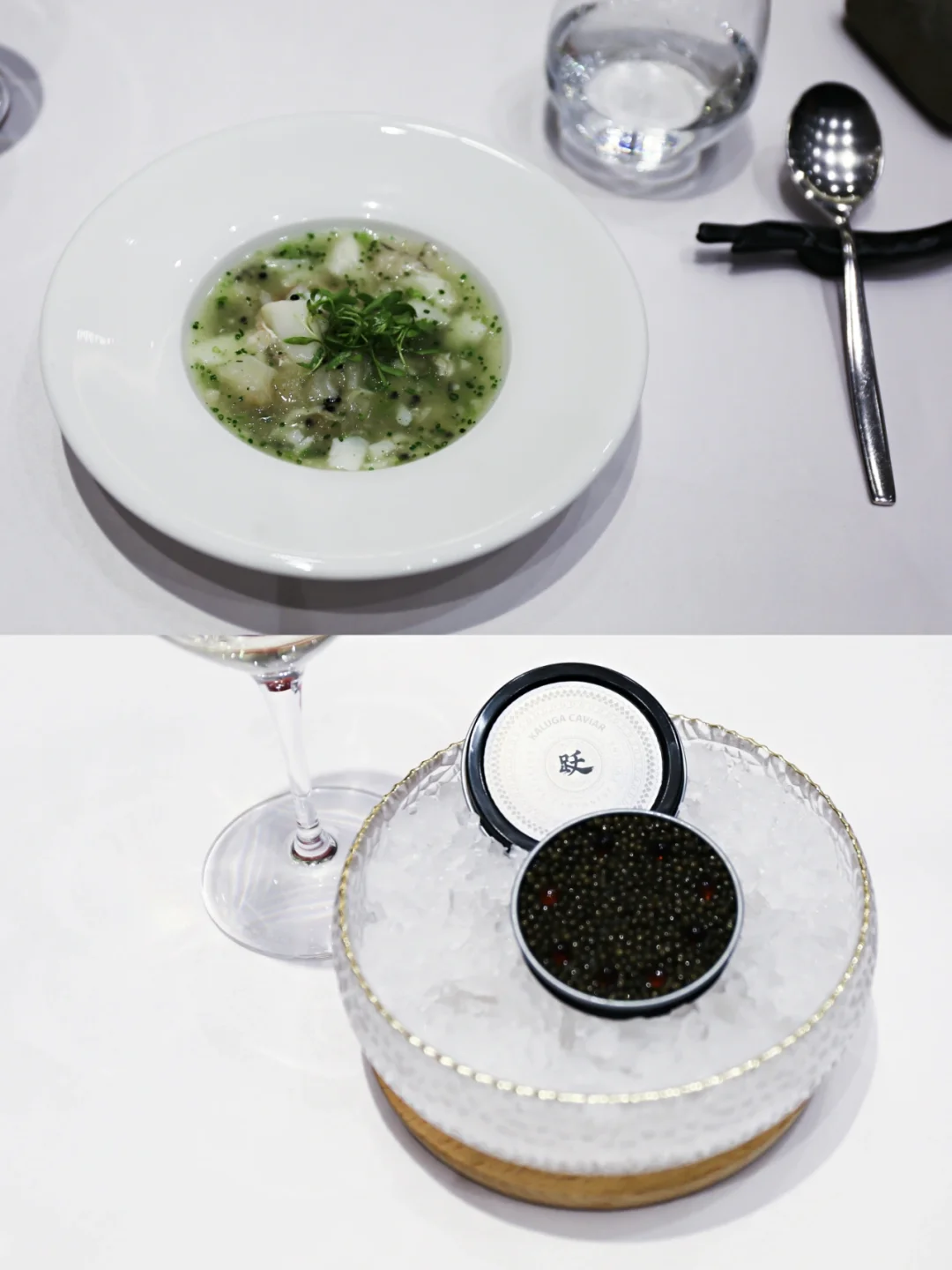 丰富西伯利亚鱼子酱覆盖着潮汕卤水鹅肝,一勺入口,鱼子酱的鲜味与浓郁的鹅肝香一同在口中溶化,再配上一口香槟,各种不同的味觉仿佛在舌尖玩捉迷藏,想扑捉它又转瞬即逝,迫不及待的想再试一口。