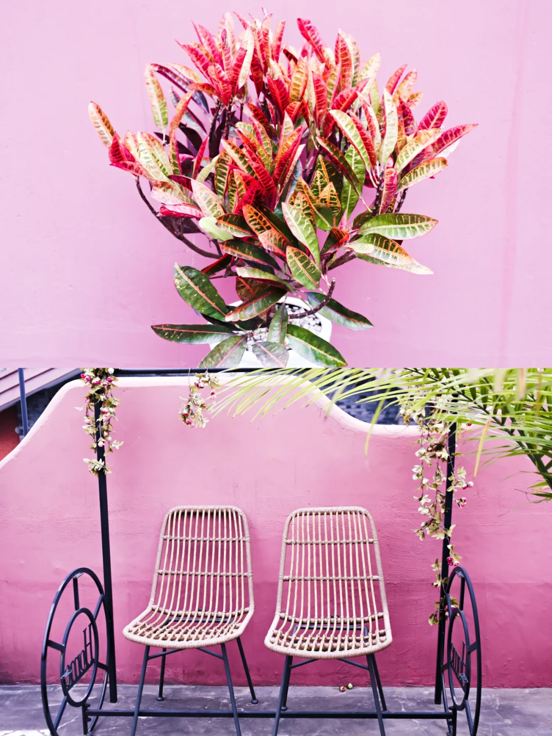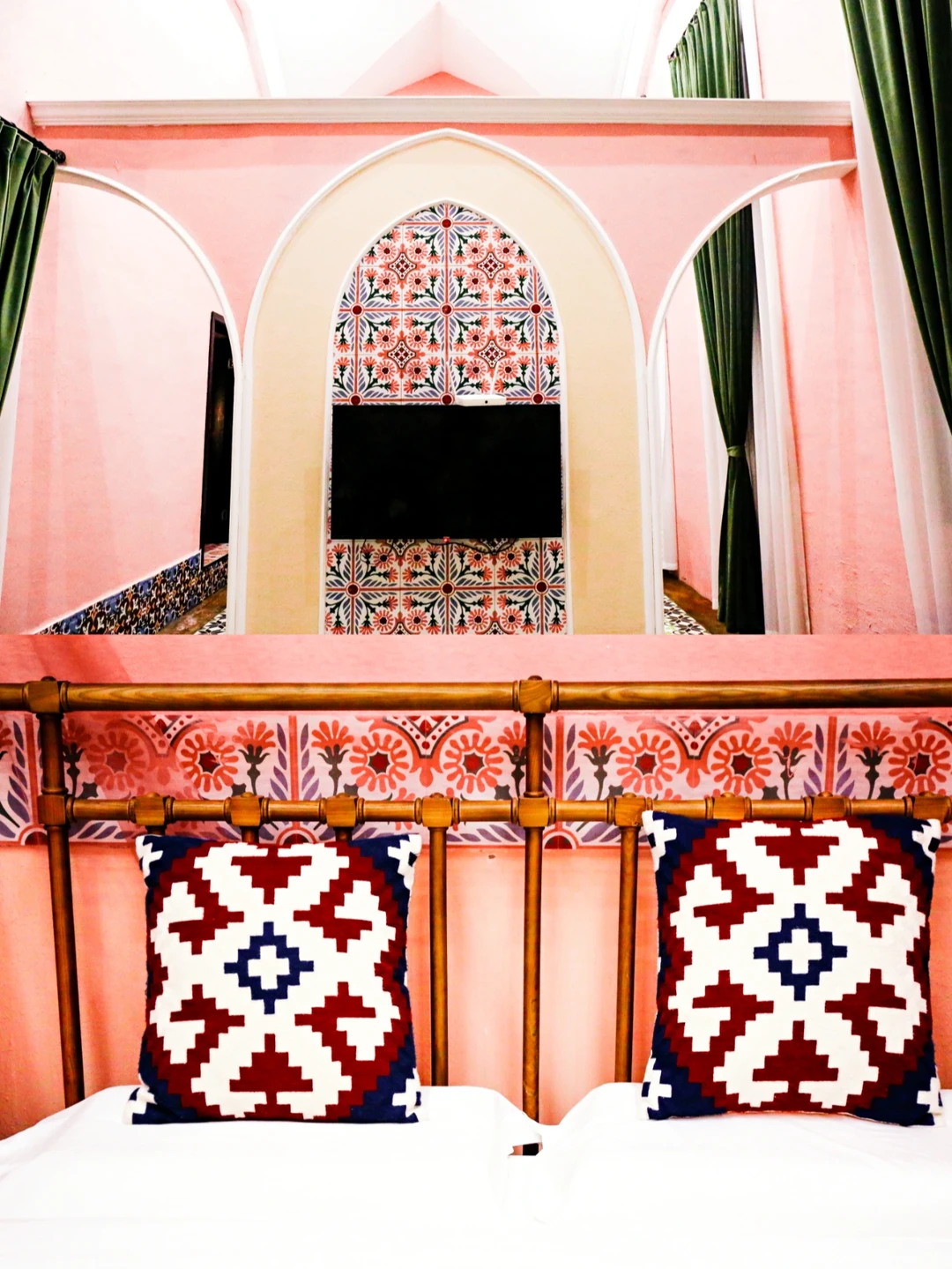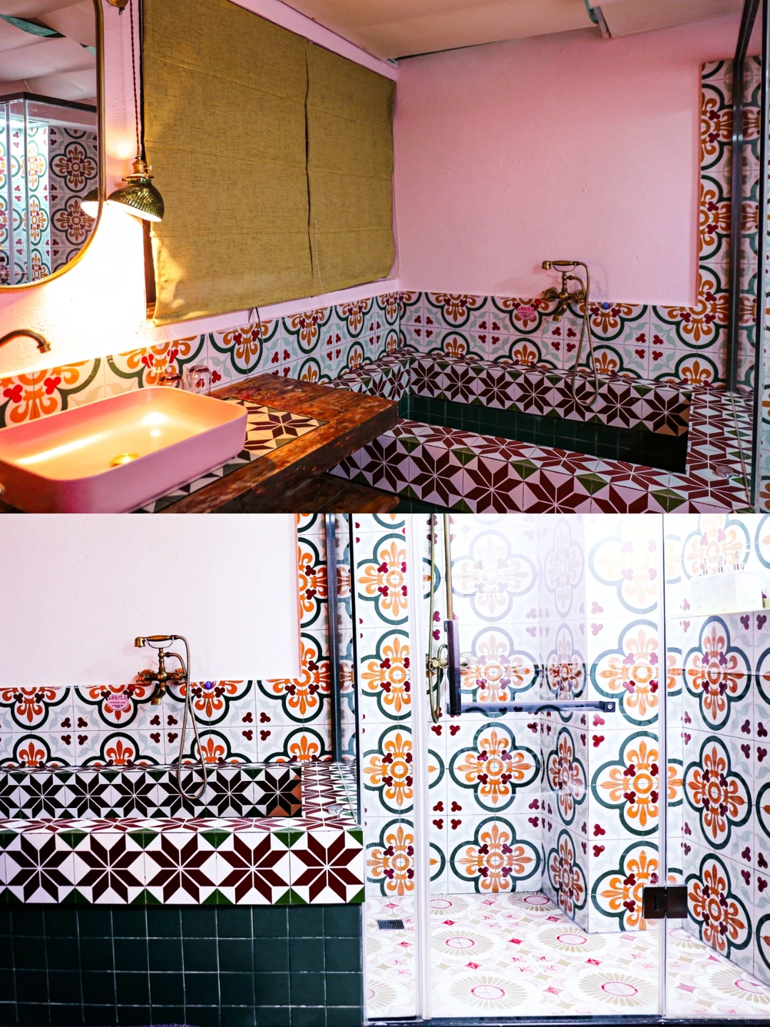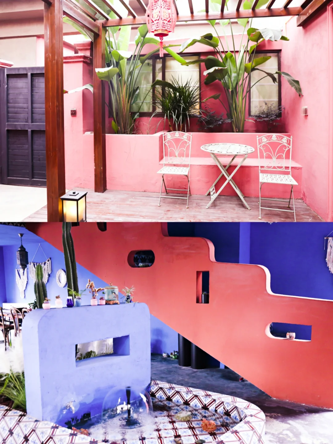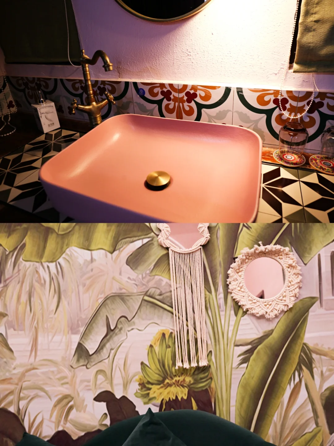 🕌客房内的院子里种有旅人蕉,绿色的植物搭配着粉红色的院墙,随手拍都是美美[Yeah]的打卡照。走进房间,屋内的花砖吸引了我。厅里、屋内,浴室,床头分别采用不同款式的花砖组合,配合椭圆形的隔门和花纹独特的靠枕,带出了浓郁的阿拉伯风情,仿佛走进一千零一夜中公主的卧室。