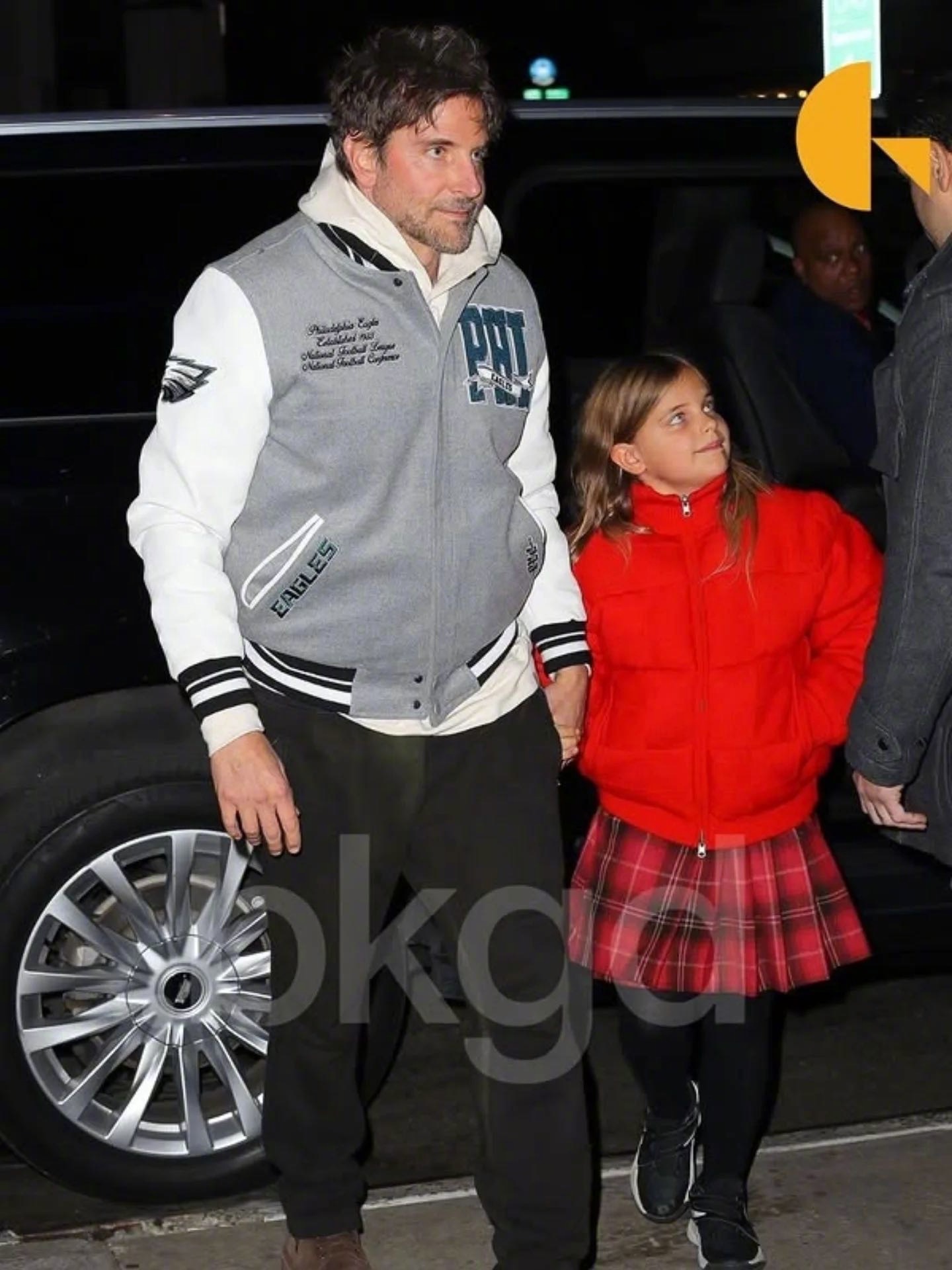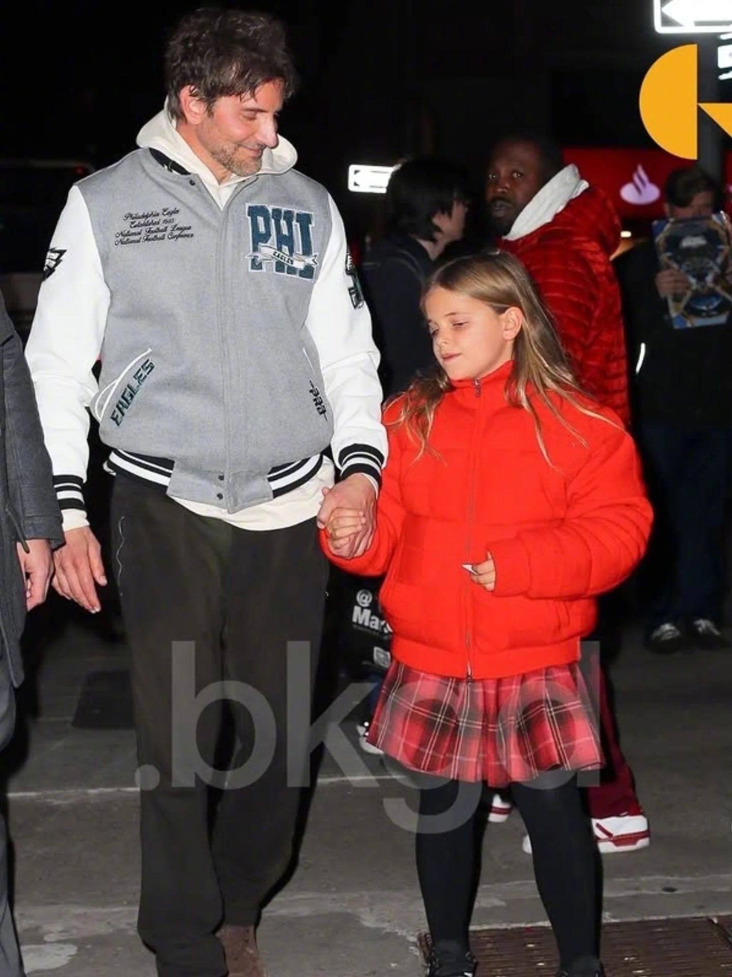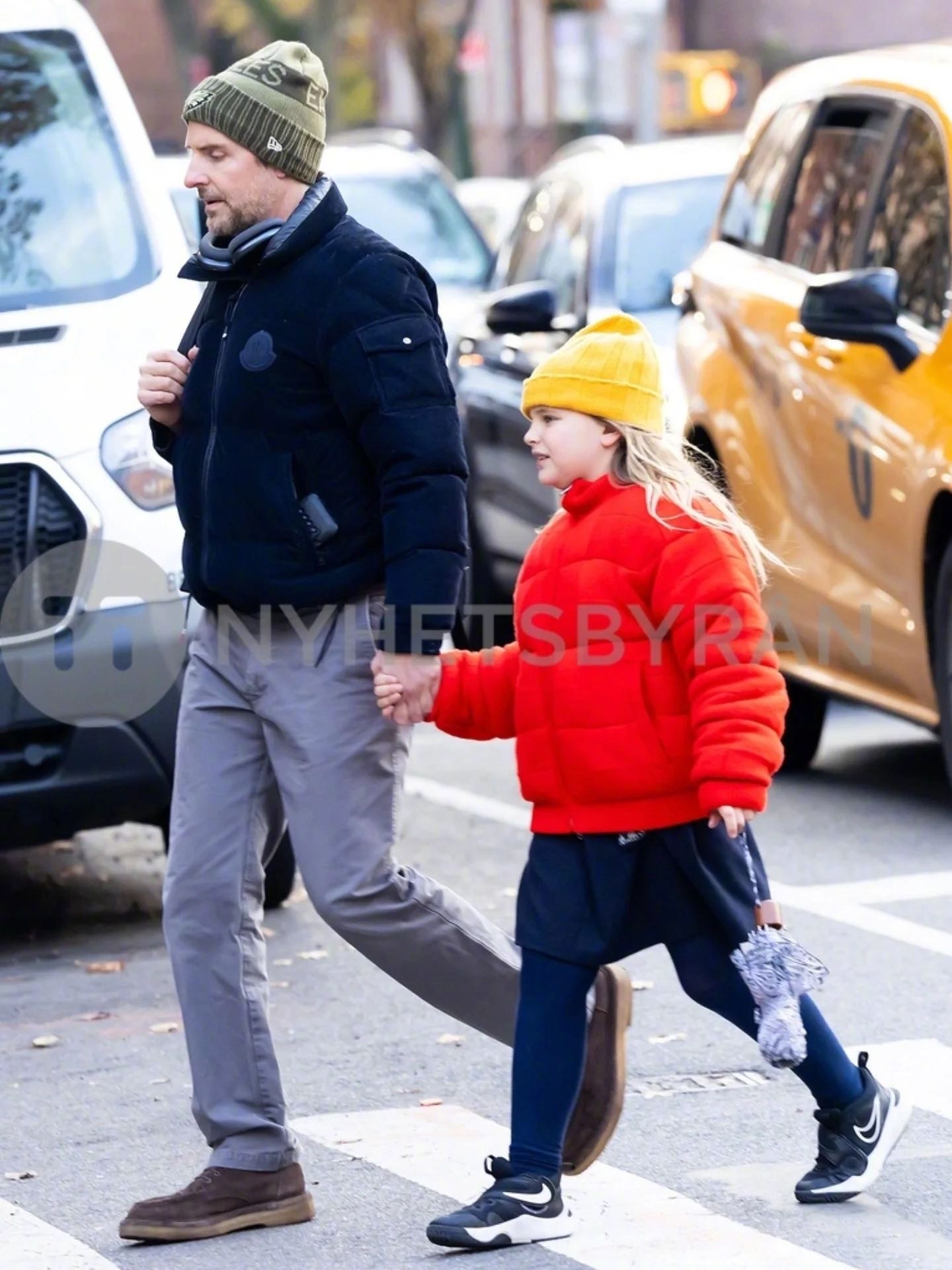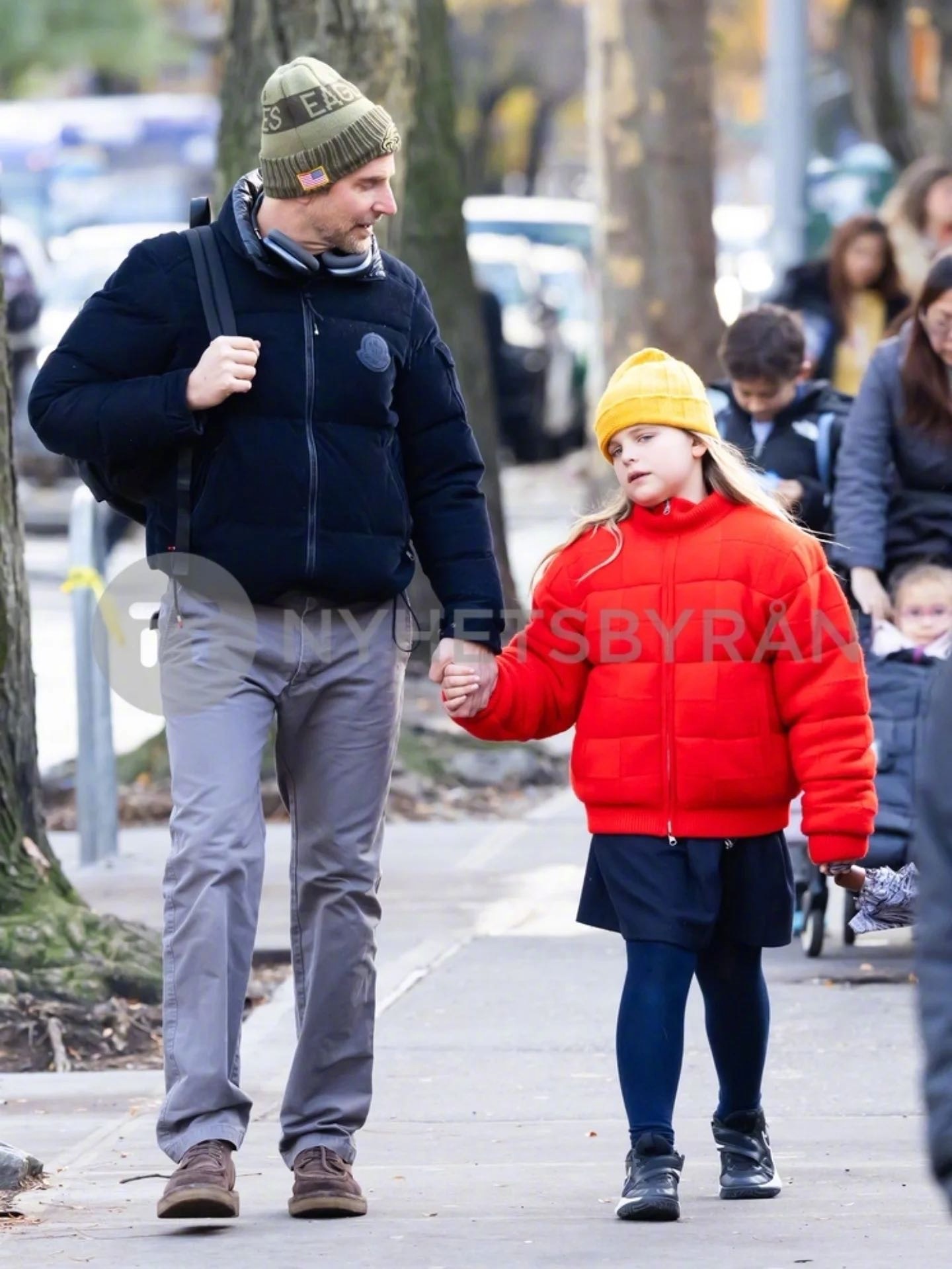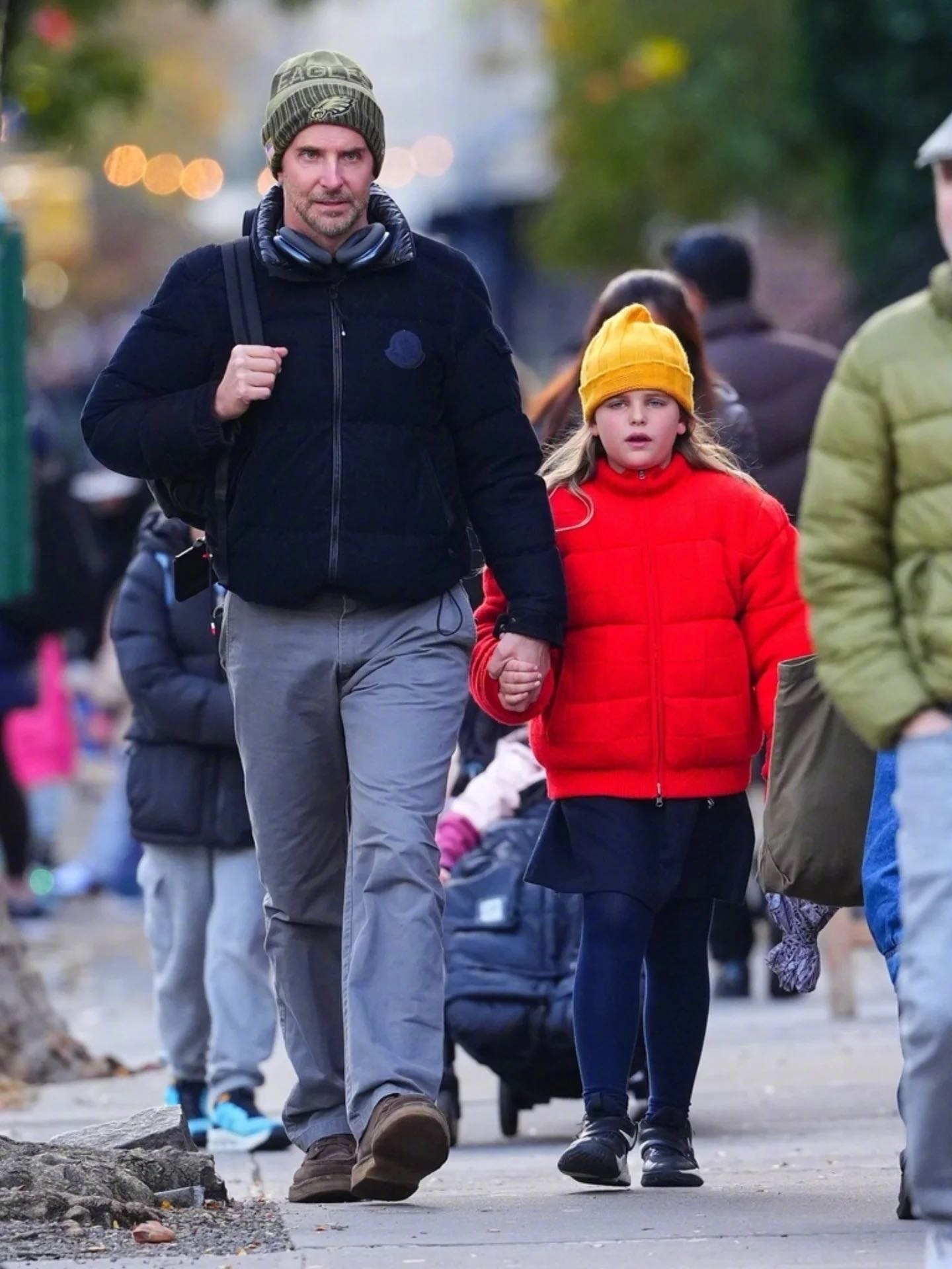 布莱德利·库珀和女儿Lea,女儿身穿的这件红色羽绒服是女友Gigi的品牌Guest in Residence 今年的最新款,售价差不多6000多人民币。头戴的黄色羊绒针织帽也是,很显然这一身是Gigi给配搭的!