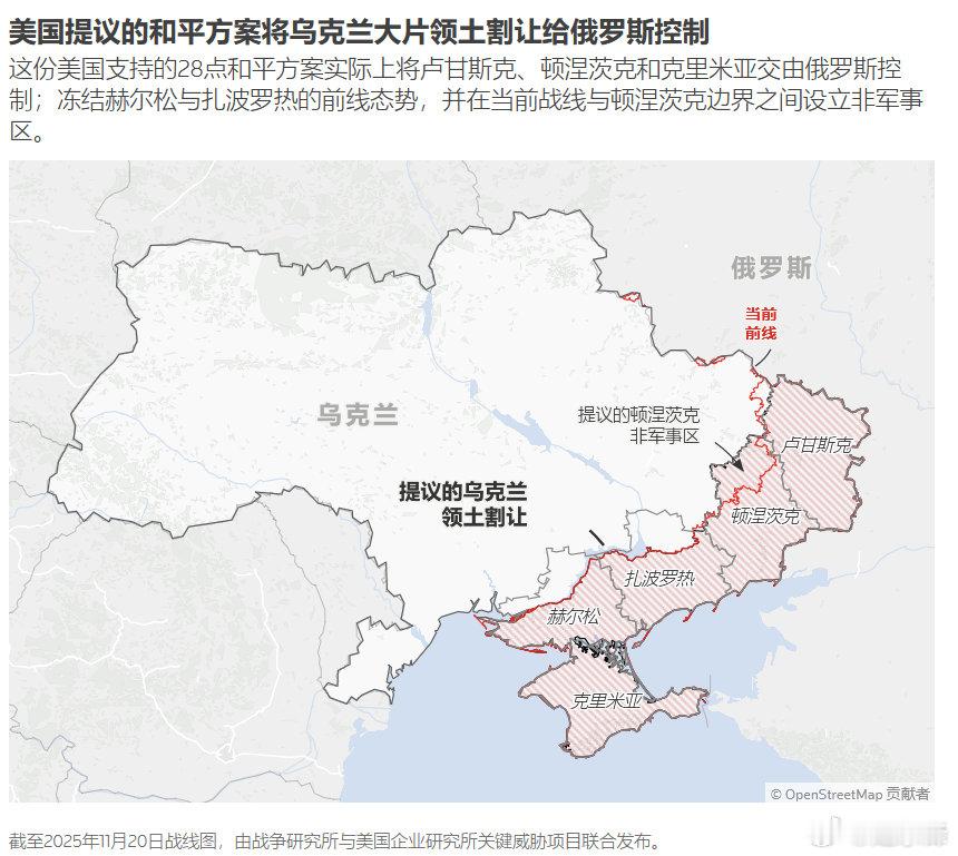 路透:美国提议的和平方案将乌克兰大片领土割让给俄罗斯控制这份美国支持的28点和平方案实际上将卢甘斯克、顿涅茨克和克里米亚交由俄罗斯控制;冻结赫尔松与扎波罗热的前线态势,并在当前战线与顿涅茨克边界之间设立非军事区。