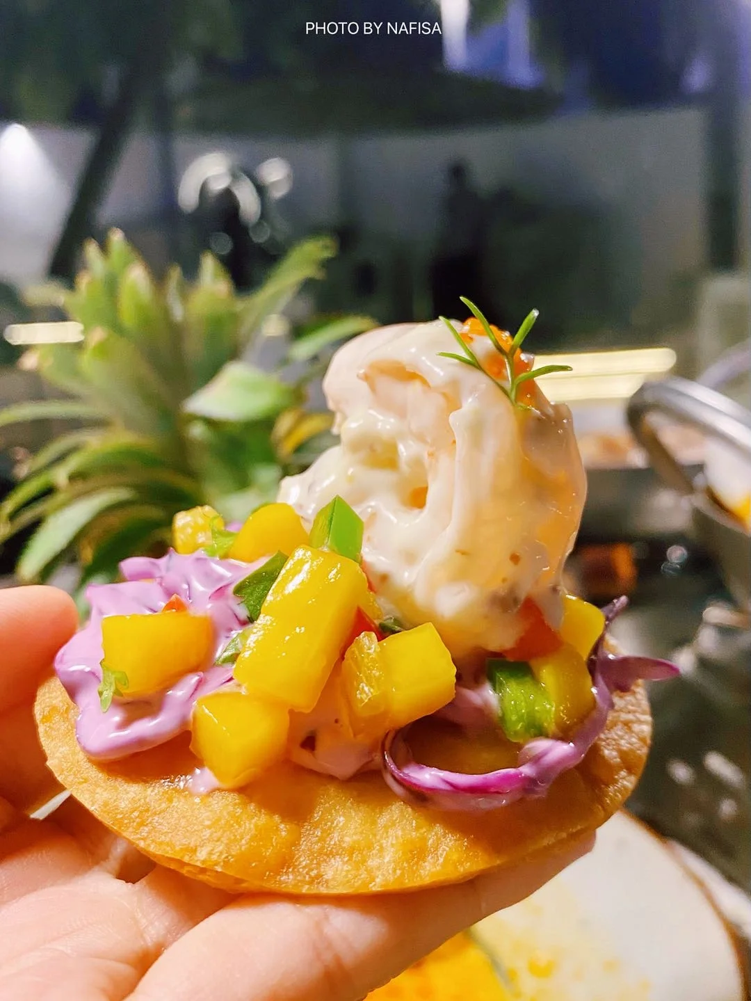 鲜虾很大只,搭配紫甘蓝、沙拉酱、青椒粒和酥脆饼底,小伙伴们一致反馈口味很不错