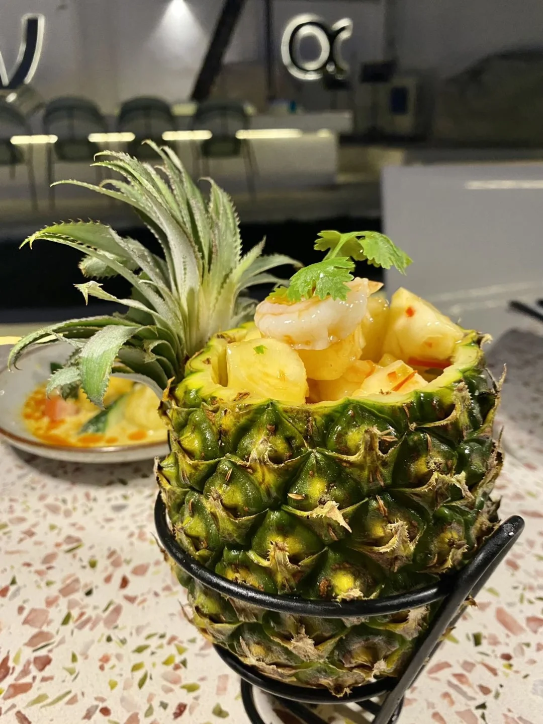 💛泰式鲜虾菠萝💛菠萝与虾仁,用泰式辣椒酱调味,装在菠萝壳里🍍好可爱吖~