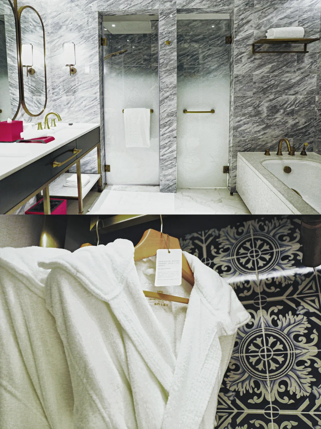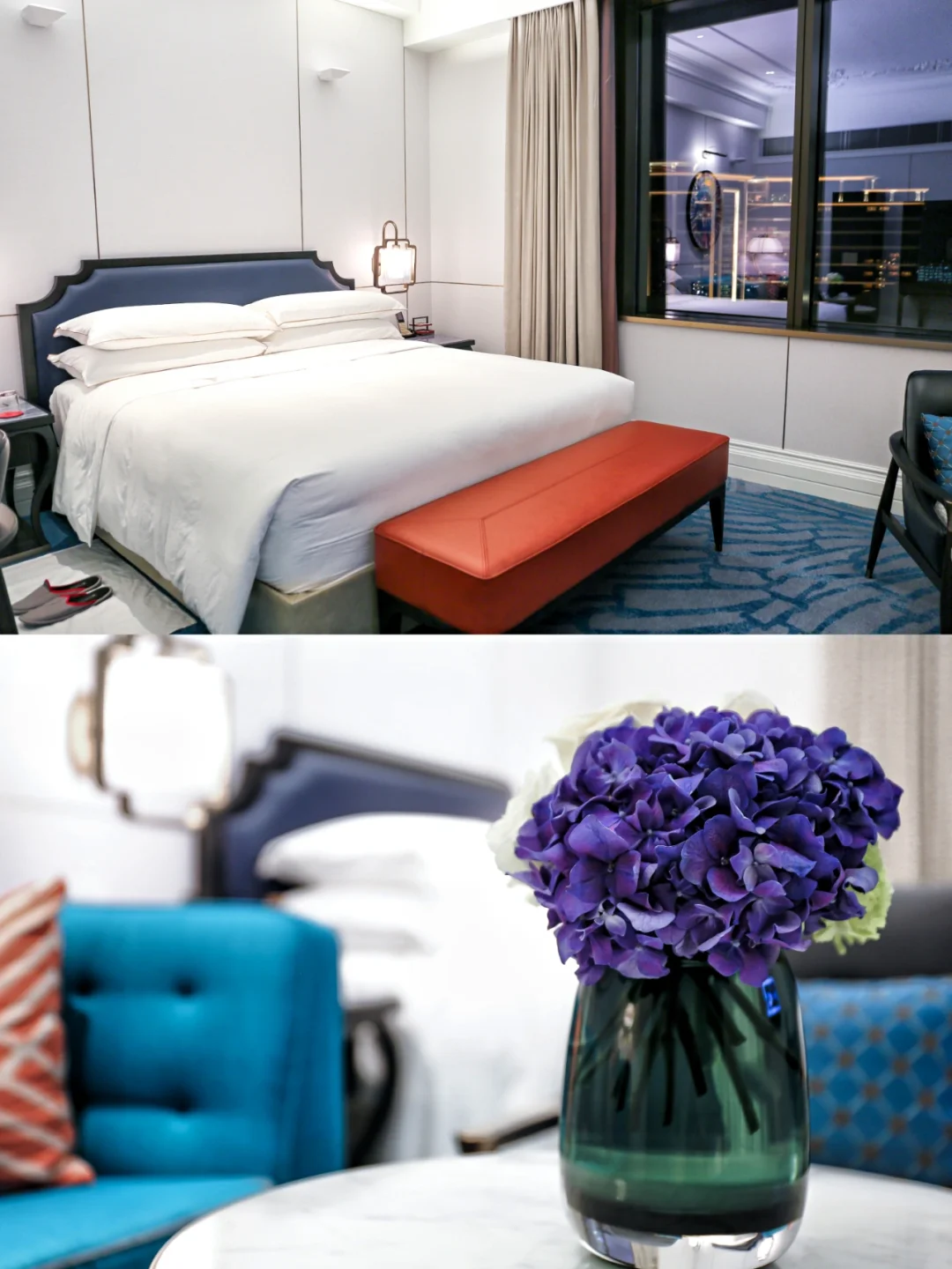 60多平米的豪华客房以白色和蓝色为主基调,中式的实木家具和西式的色彩搭配,在展现中西文化交融和谐之美的同时,也体现酒店中西合璧的优雅美学。1.8米的大床宽敞舒适,让我一觉睡到天亮,不想起床。