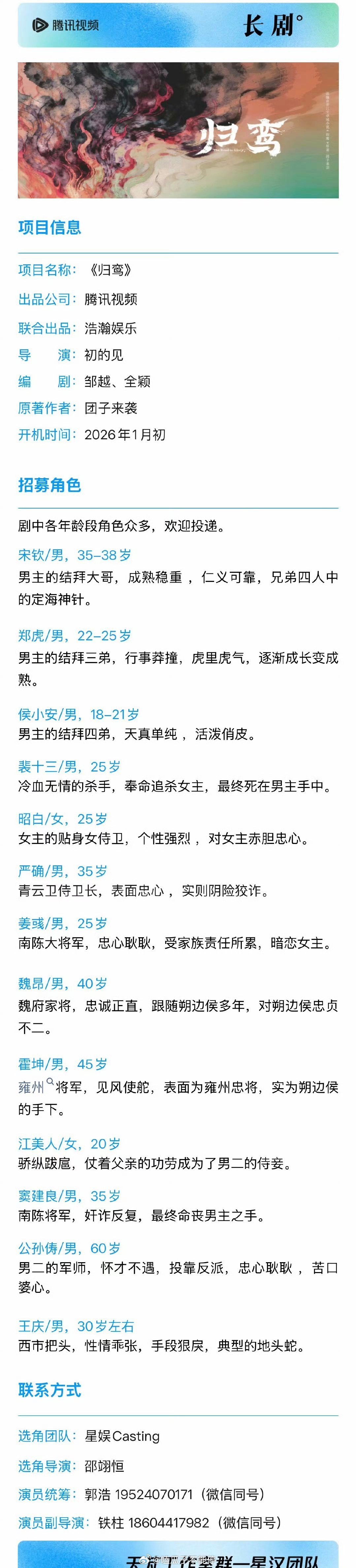 腾讯古装剧《归鸾》项目信息1月初开机主演:张凌赫、林允、古子成、张雅钦