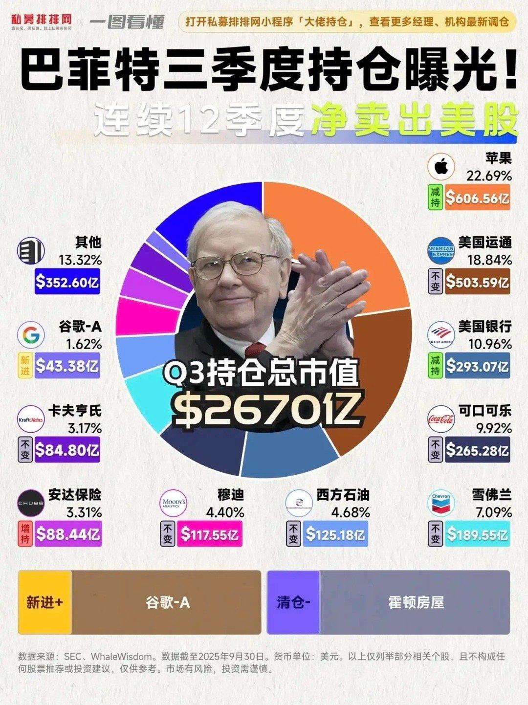 最新:股神巴菲特 三季度持仓曝光! 连续12季度净卖出美股!老巴减持了苹果和银行股。增持了保险股,同时新进了谷歌ai。咱们能参考借鉴吗?