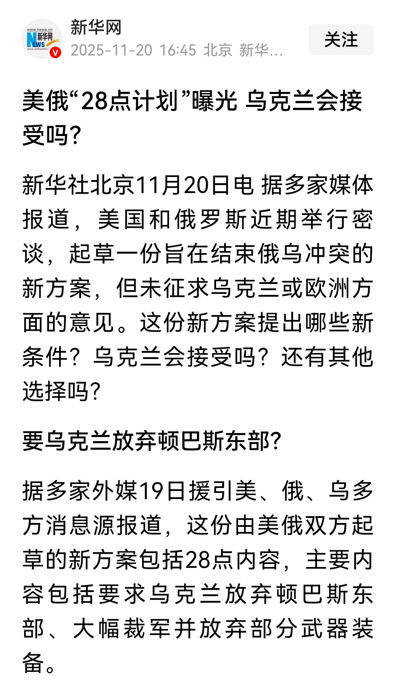 根据媒体消息,美俄密谋了两个月,给俄乌制定的和平计划草案有28条,主要包括: 1 将乌东地区租给俄罗斯; 2 解除对俄罗斯的制裁; 3 停止战争罪调查; 4 乌克兰必须将其军队减半; 5 乌克兰不得有远程武器; 6 禁止外国军队在其领土上驻扎; 7 俄语和教会在俄罗斯控制的被占领土上获得官方地位; 8 乌克兰获得美国和欧洲的安全保证。 欧洲肯定是不赞成的,乌克兰应该也不敢签这个字,这比战败还耻辱。美俄弄出这么个破烂玩意,无论谁看了都不舒服,太欺负人了。