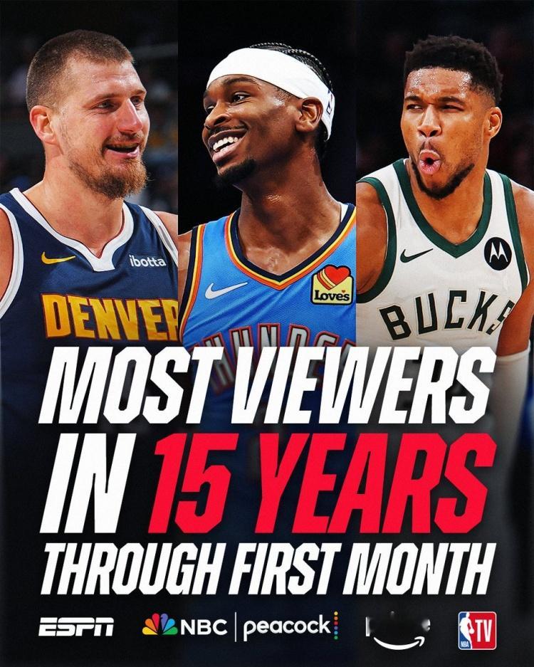 官方:本赛季NBA社媒首月浏览量已超300亿次 创历史纪录!今日NBA官方宣布,本赛季常规赛首月通过NBC/Peacock、亚马逊Prime Video及ESPN平台播出的全国直播赛事,已吸引超过6000万观众,创下近15年来开赛阶段最高收视纪录。此外,由联盟官方及第三方运营的社交媒体平台上,NBA相关内容浏览量已突破300亿次,创下赛季首月历史新高。