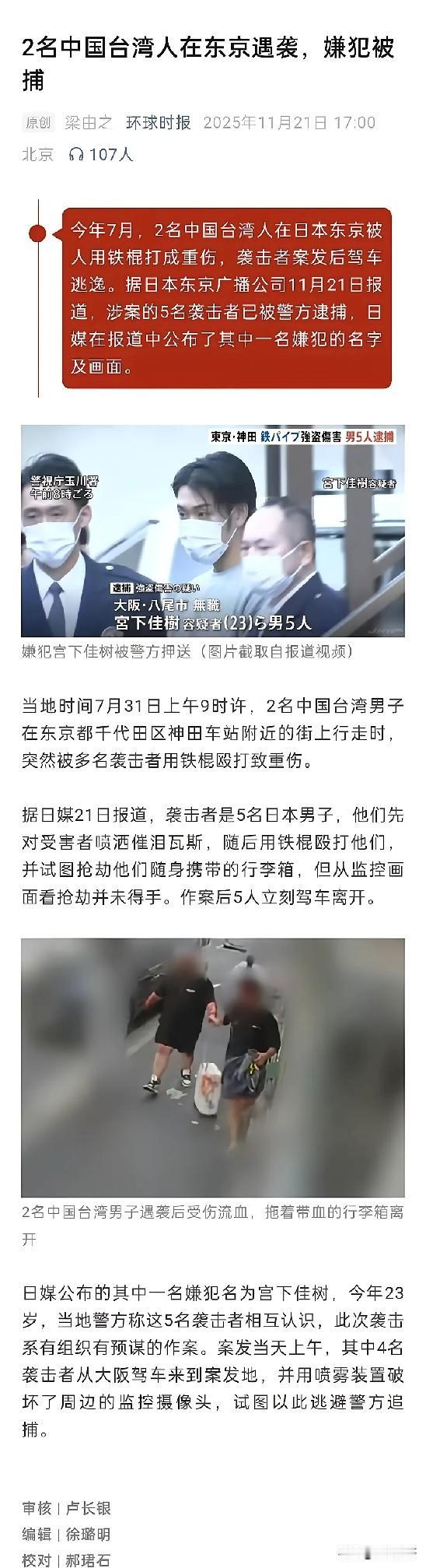 那两位被殴打的台湾人现在估计肠子都悔青了!他们后悔的不是去日本旅游,也不是随身带了贵重物品,而是一腔热情错付。 案件细节让人心寒。5个日本人有预谋地从大阪开车到东京,先喷监控,再喷催泪瓦斯,最后用铁棍打人抢箱子。 我开始有点理解胡锡进的评论了。他说袭击者目标就是中国人,他们分不清大陆和台湾人。最无奈的是,挨打的台湾人很可能是亲日的。台湾当局一些政客长期媚日,修改教科书美化殖民历史,地震时抢先捐款日本却慢待本地灾情。 这起案子在日本右翼排外情绪抬头的背景下发生,但破案后台湾当局依旧沉默。反而是大陆持续敦促日方追查到底。那两位受伤的人或许此刻才明白,血脉之亲比刻意讨好更有力量。