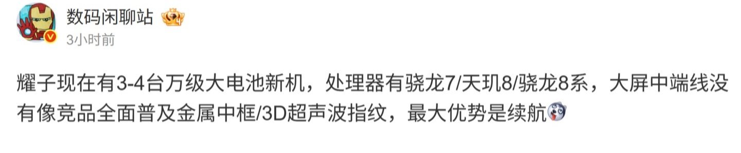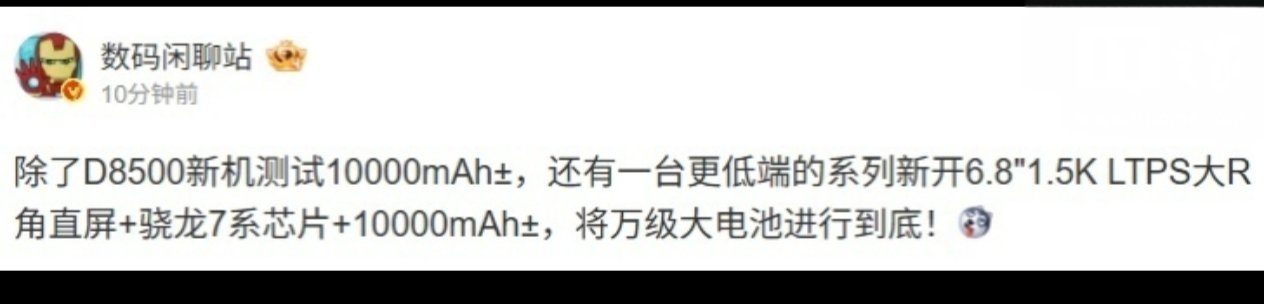 【消息称荣耀现有 3-4 台万级大电池新机,搭载高通骁龙 7 / 骁龙 8、联发科天玑 8 系芯片】博主 数码闲聊站在微博透露,某“耀子”厂内部现在有 3-4 台万级大电池新机。博主表示,这些手机的处理器各有不同,分别搭载高通骁龙 7 / 骁龙 8 和联发科天玑 8 系芯片,其中的大屏中端产品线没有像竞品那样全面普及金属中框和 3D 超声波指纹,最大的优势还是续航。后续有用户在评论区询问:“Turbo5Pro 电池有没有 9”,博主回复道:“你猜”;另一名用户则询问道:“屏幕多大”,博主回复道:“常规大屏,6.7x-6.8x”;而另外一名网友则询问道:“GT2pro 不是说有金属中框吗”,博主则回复道:“有啊,GT 系列定位是中高端,毕竟 8E+8E5 旗舰芯”。结合博主评论区回复,这几台手机将在 12 月开始陆续发布,同时根据博主文中暗示和评论区猜测,预计这几台机器中有荣耀 X80、Power 2、GT2 等。某厂有一台手机新开 6.8"1.5K LTPS 大 R 角直屏 + 骁龙 7 系芯片 + 10000mAh± 电池,预计为荣耀旗下。