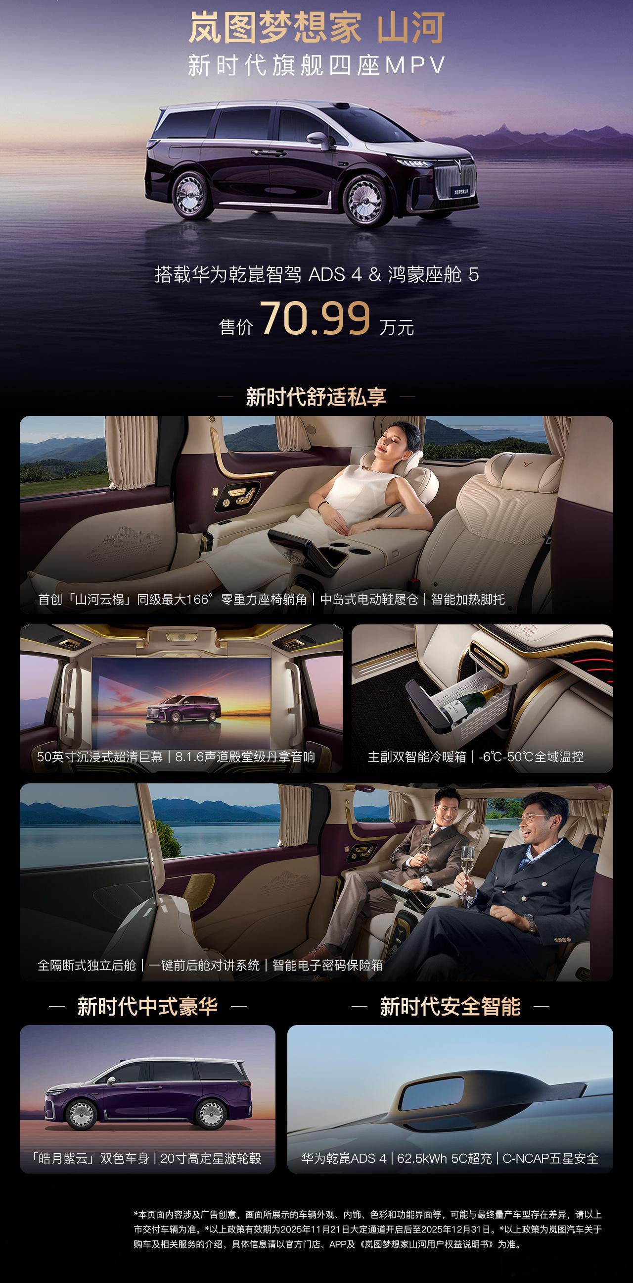 岚图梦想家山河怎么样?一篇文章带你了解各位,你们有没有看岚图梦想家山河的上市发布会直播呢?信息量真的非常大!这里有一篇详细的解读,带你深入了解这款新时代旗舰四座MPV——岚图梦想家山河~这款车型首创了「山河云榻」座椅,拥有同级别最大的166°零重力躺角,并配备了智能加热脚托,让你体验到如同“移动头等舱”般的舒适感受!车内还配备了中岛式电动鞋履仓、50英寸沉浸式超清巨幕以及8.1.6声道丹拿音响系统,无论是影音娱乐还是收纳功能都十分出色~此外,岚图梦想家山河还搭载了华为最新的智驾辅助系统和5C超充技术,确保了智能与安全的双重保障!作为一款集顶尖安全科技、私享舒适和中式豪华于一身的高端旗舰MPV,各位老板们还不赶紧安排上?