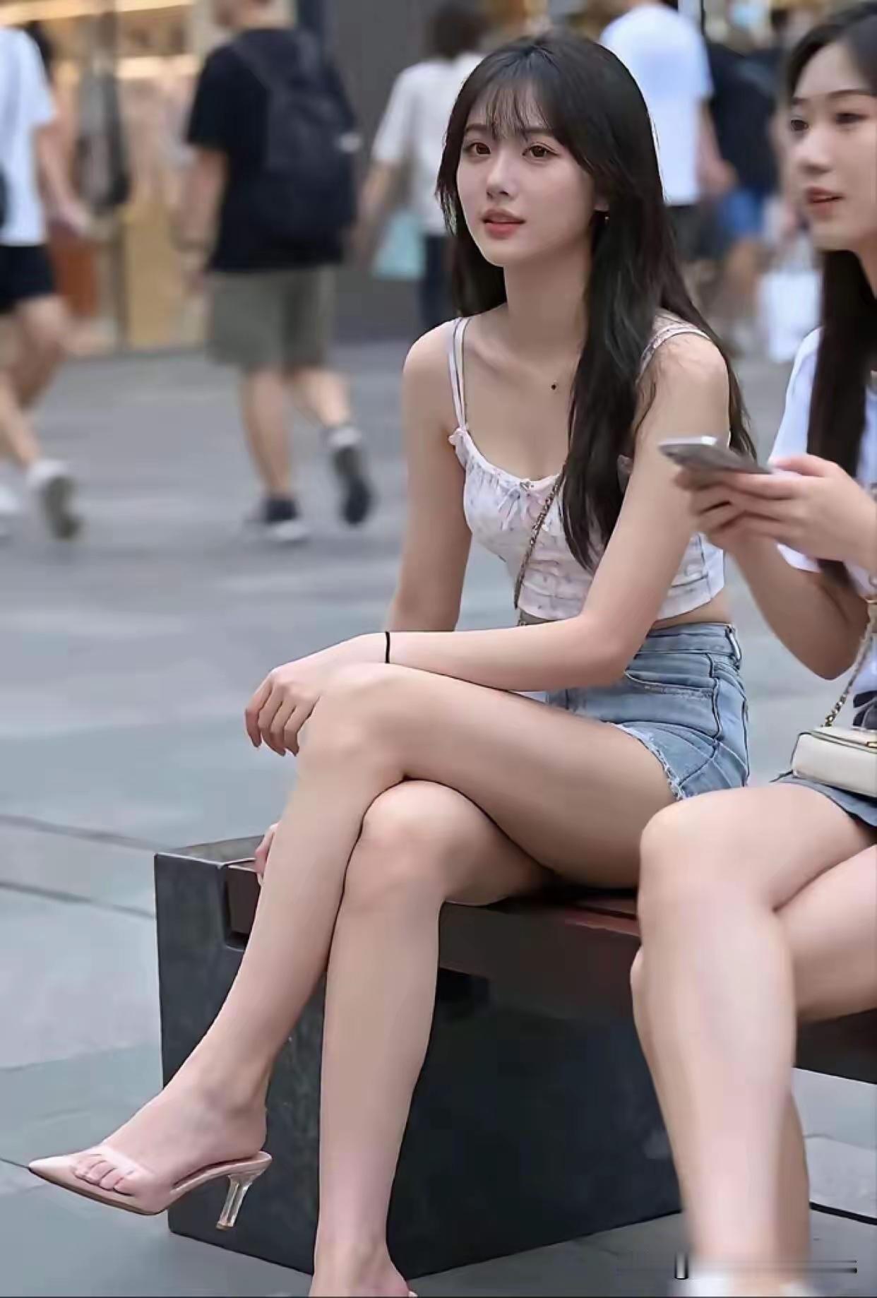 两位女生在街头休息聊天。街头碰见的女