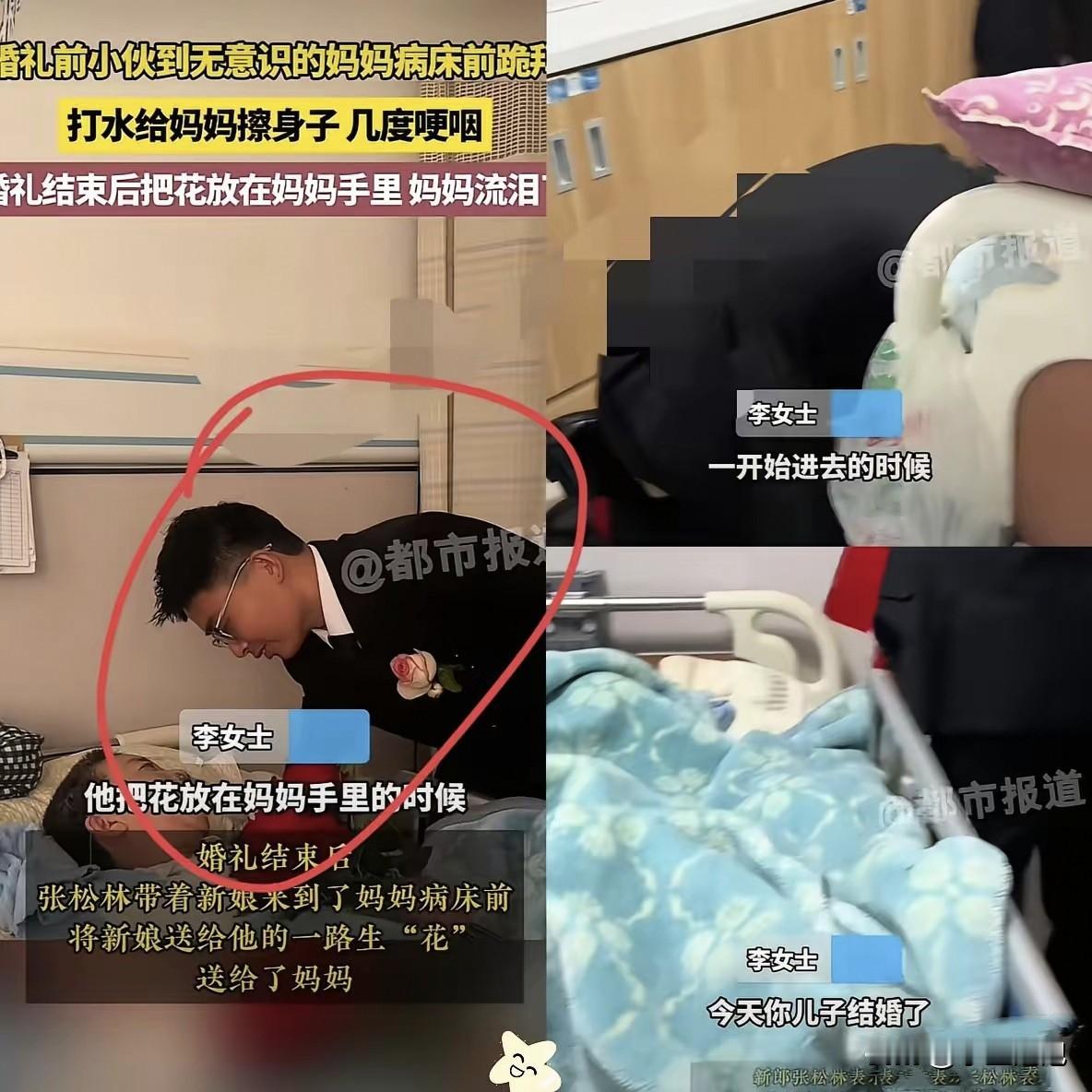 泪目!河南男子结婚当天,没先去接新娘,直奔医院跪在昏迷妈妈病床前:“妈,我今天结婚啦,你看看我帅不帅?” 这事发生在河南,新郎叫张松林。 婚礼当天一早,他没按常规流程接新娘。 穿着笔挺西装,第一站直接冲去医院。 病房里,妈妈已昏迷多年,毫无意识。 他双膝跪地,脸凑到妈妈耳边,声音带颤:“妈,我今天结婚啦,你看看我帅不帅?” 这一幕被同病房的人拍下。 很快在网上传开,网友瞬间破防。 张松林的妈妈,几年前突发意外昏迷。 从那以后,他成了医院的“常客”。 每天下班再晚,必来给妈妈擦身、喂饭、按摩。 跟妈妈讲白天的事,哪怕从没有回应。 护士说:“这小伙子太孝顺,这么多年一天没落过。” “有时候累得在走廊偷偷掉泪,转身对阿姨还是笑盈盈的。” 婚礼当天,他给妈妈擦身子。 毛巾拧了又拧,好几次捂着嘴差点哭出声。 “妈,您要是醒着,肯定会夸我今天穿得精神……” 婚礼仪式一结束,他带着新娘和手捧花,又回了医院。 把花轻轻放进妈妈手里时,奇迹发生了。 妈妈的眼角,突然滑下一滴泪。 病友惊呼:“我在这待了快一年,从没见阿姨有过反应!” “母爱太神奇,昏迷都挡不住对儿子的牵挂!” 张松林紧握妈妈的手,哽咽着说:“妈,您听到了对不对?” “儿子结婚了,您放心,我会好好过日子,一直等您醒来。” 这事在网上炸开锅。 有人说:“这才是真孝顺,风光时从没忘了妈。” 也有人感慨:“现在很多人,给父母打个电话都嫌麻烦。” 这个大家都喊“忙”的时代,“久病床前无孝子”的说法总被提起。 但张松林用几年的坚持,和婚礼当天的选择,狠狠打破了偏见。 结婚是一辈子大事,可在他心里。 让妈妈“参与”自己的人生高光时刻,比任何排场都重要。 想想我们身边,多少人把“等有空陪爸妈”挂在嘴边。 却总被琐事耽搁,直到错过才后悔。 张松林的故事,像一面镜子。 照出了很多人的愧疚。 他没做惊天动地的事。 就是在平凡日子里守着妈妈,重要时刻想着妈妈。 这种孝顺,不是一时冲动。 是刻在骨子里的牵挂。 你觉得张松林的选择对吗? 如果是你,婚礼当天会先去看妈妈吗? 你身边有没有这样感人的孝心故事? 来评论区说说,我们一起聊聊“孝顺”该怎么写。