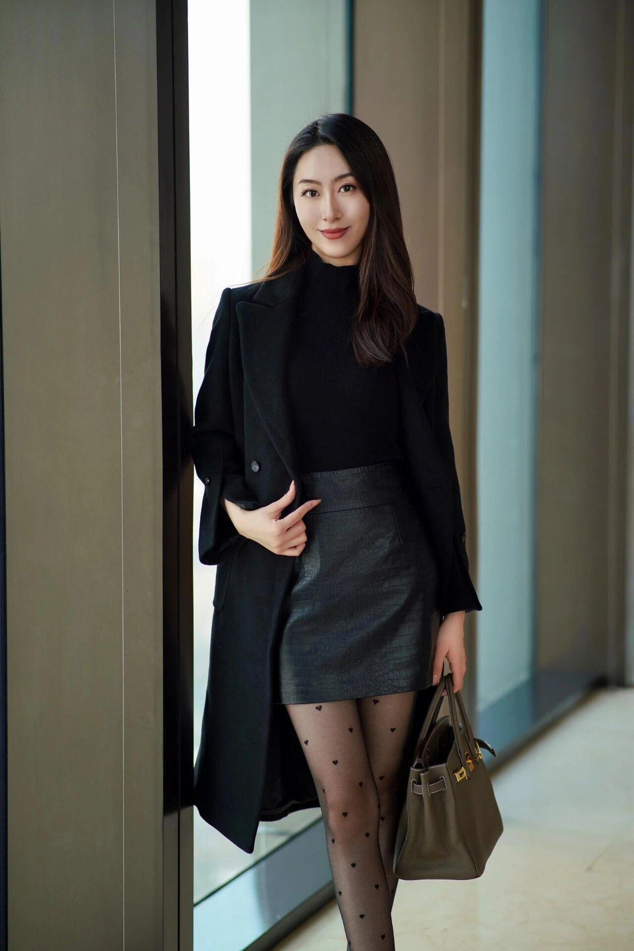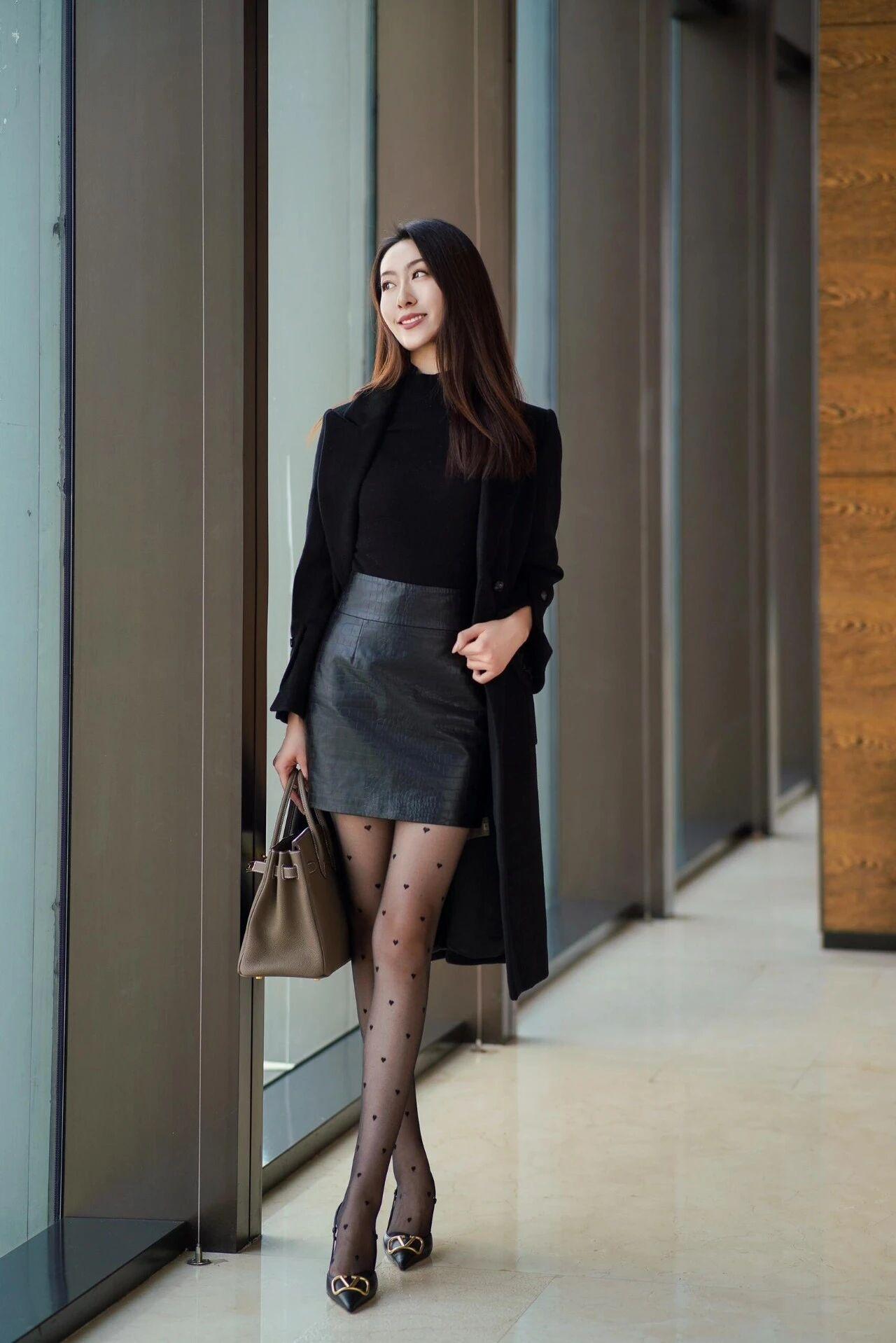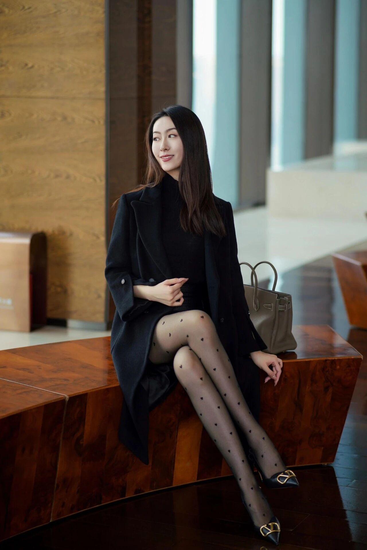 黑色波点丝袜配黑色大衣又性感又霎