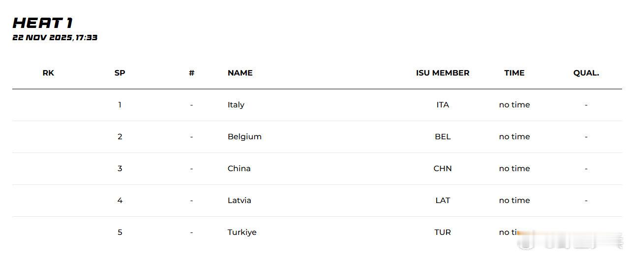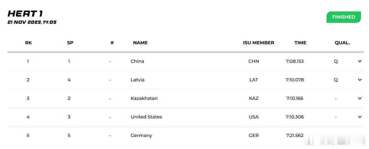 25-26赛季短道速滑世巡赛第三站波兰格但斯克男子5000米接力1/4决赛中国队滑出7:08.153,排名小组第一晋级半决赛半决赛中国队和意大利、比利时、拉脱维亚、土耳其同组