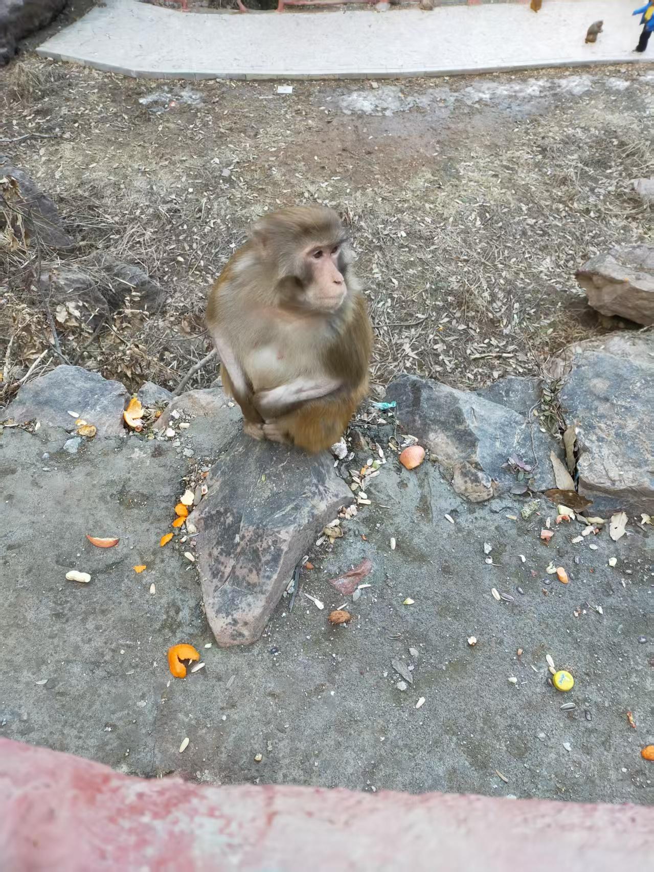 瞧这猴子,往石头上一坐,跟个小大人似的。周围撒着橘子皮、花生壳,估计是游客喂的。它歪着脑袋,眼神贼机灵,也不知道在琢磨啥呢。地上还掉了个小糖纸,它也没兴趣,就这么酷酷地坐着,跟这荒草地、大石头组成了一幅挺有意思的画面,像在自己的小地盘上思考“猴生”呢。