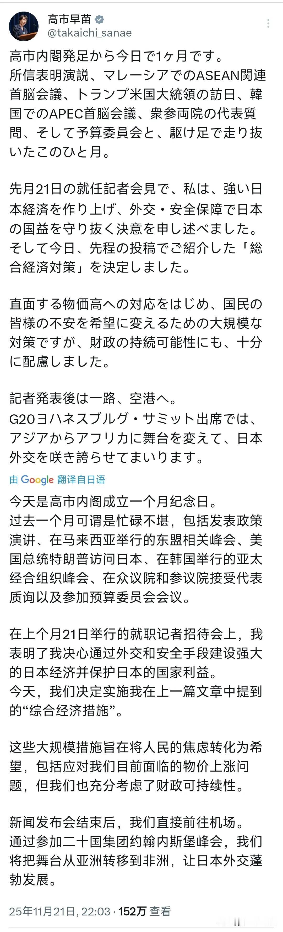 日本首相高市早苗昨晚(11月21日晚)在社交媒体发文写道:“今天是高市内阁成立一个月纪念日。过去一个月可谓是忙碌不堪,包括发表政策演讲、在马来西亚举行的东盟相关峰会、美国总统特朗普访问日本、在韩国举行的亚太经合组织峰会、在众议院和参议院接受代表质询以及参加预算委员会会议。 在上个月21日举行的就职记者招待会上,我表明了我决心通过外交和安全手段建设强大的日本经济并保护日本的国家利益。 今天,我们决定实施我在上一篇文章中提到的‘综合经济措施’。 这些大规模措施旨在将人民的焦虑转化为希望,包括应对我们目前面临的物价上涨问题,但我们也充分考虑了财政可持续性。 新闻发布会结束后,我们直接前往机场。通过参加二十国集团约翰内斯堡峰会,我们将把舞台从亚洲转移到非洲,让日本外交蓬勃发展。 评几句 高市早苗的“一个月总结”字里行间全是自我加戏,实质却经不起推敲—— 把例行公务包装成“史诗行程”,连“机场赶飞机”都要写进行程亮点,堪称小学生级别的“加班秀”; 所谓“综合经济措施”只是老酒装新瓶,既没触及日元贬值的结构性病根,又不敢对能源、粮价飙升拿出可执行方案,一句“充分考虑财政可持续性”不过是提前给选民打预防针:钱不会多,口号管饱; 外交层面更露怯:东盟、APEC、G20连轴转,却只见拍照打卡,不见实质成果;对中韩口风强硬,对美则是“欢迎特朗普再访”的隔空示好,把“平衡外交”玩成了“选边站”的独角戏; 最讽刺的是,她一边高喊“把焦虑变成希望”,一边用制造外部紧张来转移内部焦虑,把中日韩民间好不容易修复的互信再次当耗材。这种饮鸩止渴的“希望”,只会把日本经济进一步锁死在通胀与衰退的夹缝里。 一个月就忙成这样,成绩单却只剩“我跑了很多机场”,下次是不是要拿飞行里程给国民当补贴?