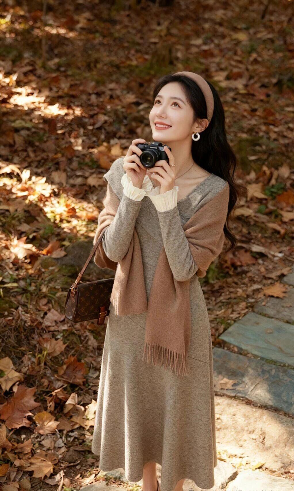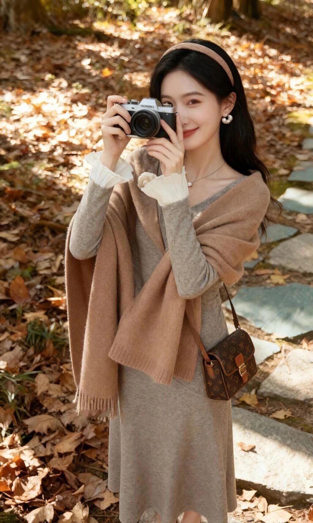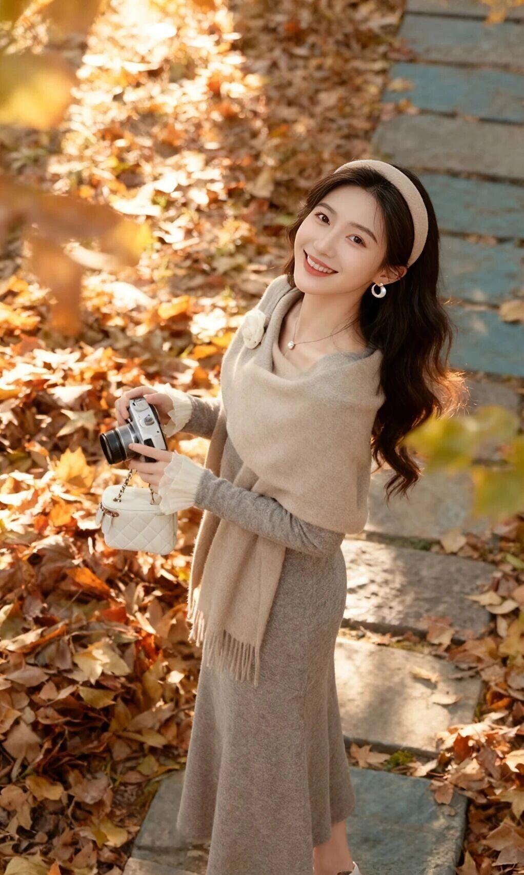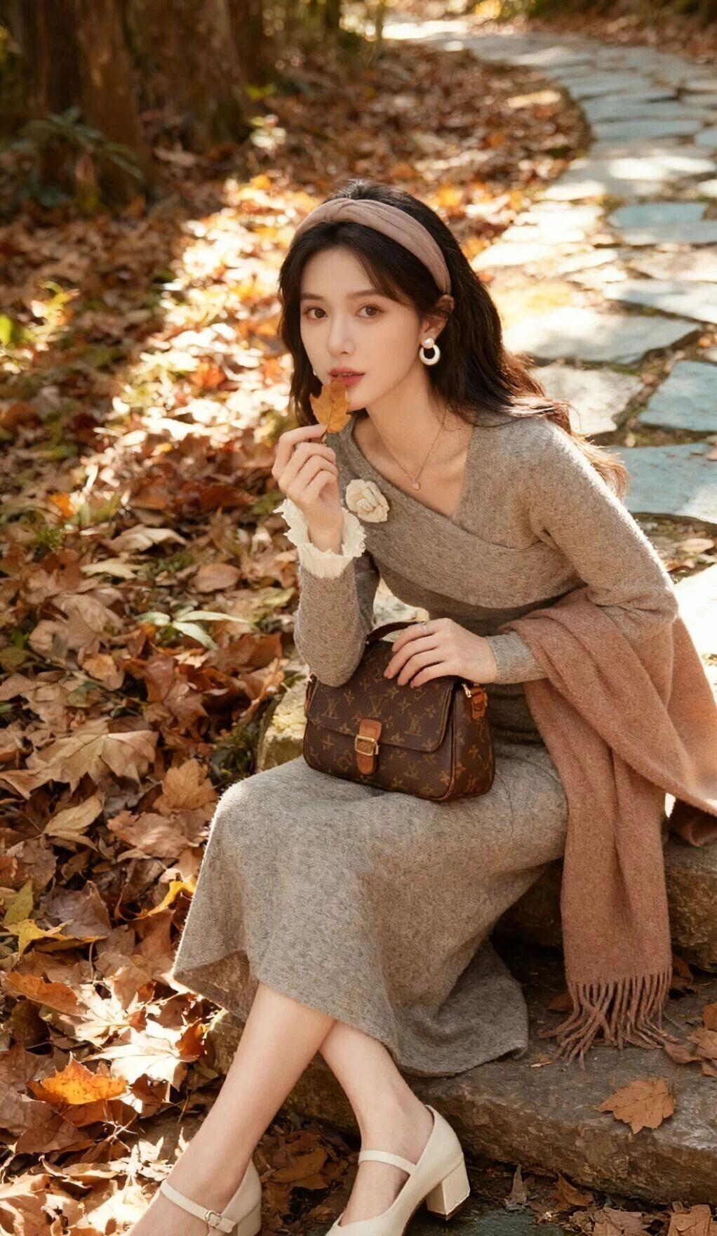 《秋叶私语》 石阶上的女子像片被遗忘的书签,灰裙摆铺开成摊开的信笺。金黄的银杏叶在她脚边堆成松软的毯子,每片叶脉里都藏着阳光酿的蜜。她指尖拈着的落叶像把金色钥匙,正轻轻叩响秋天的门扉。 米色开衫的流苏在风中轻颤,与发带上的丝绒蝴蝶结跳着双人舞。圆耳环在耳垂摇晃,折射的光斑落在LV老花包上,让那些经典花纹都活了过来,变成游动的金色小鱼。白高跟鞋尖沾着片枫叶,鞋跟与青苔斑驳的石阶轻声耳语,讲述着夏日未说完的故事。 风掀起她鬓角的碎发时,树影在裙面跳起华尔兹。远处林间传来山雀的啼鸣,与落叶坠地的沙沙声编织成秋天的五线谱。她忽然想起昨夜读的那本诗集,泛黄纸页间夹着的枯叶标本,此刻正在掌心重新舒展脉络。 包链突然发出清脆的碰撞,惊醒了沉睡在石缝里的蚂蚁。她低头看时,阳光正穿过叶隙,在LV花纹上投下跳动的光斑,像无数个小小的金色铃铛。远处飘来糖炒栗子的甜香,混着泥土与落叶的气息,在鼻尖调成秋天的鸡尾酒。她起身时,裙摆带起一阵小小的旋风,那些金黄的叶子便跟着跳起了圆舞曲,在石阶上写下秋日的诗行。