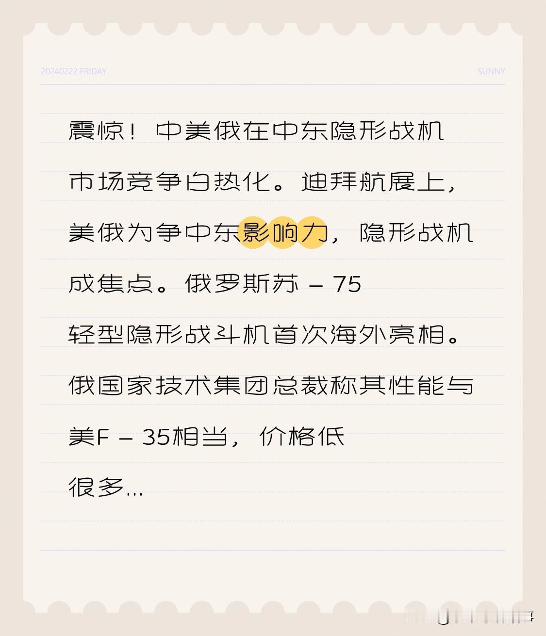 震惊!中美俄在中东隐形战机市场竞争白热化。迪拜航展上,美俄为争中东影响力,隐形战机成焦点。俄罗斯苏 - 75轻型隐形战斗机首次海外亮相。俄国家技术集团总裁称其性能与美F - 35相当,价格低很多,基本价3000 - 3500万美元,F - 35近亿美元。 F - 35和苏 - 57E航展罕见同台。美拟售沙特F - 35,俄联合飞机制造公司提供产品并涉及技术转让。苏 - 57E未出口,成本性能未知。因操作维护成本高,部分国家或选没那么先进的型号。中国战机表现值得期待。