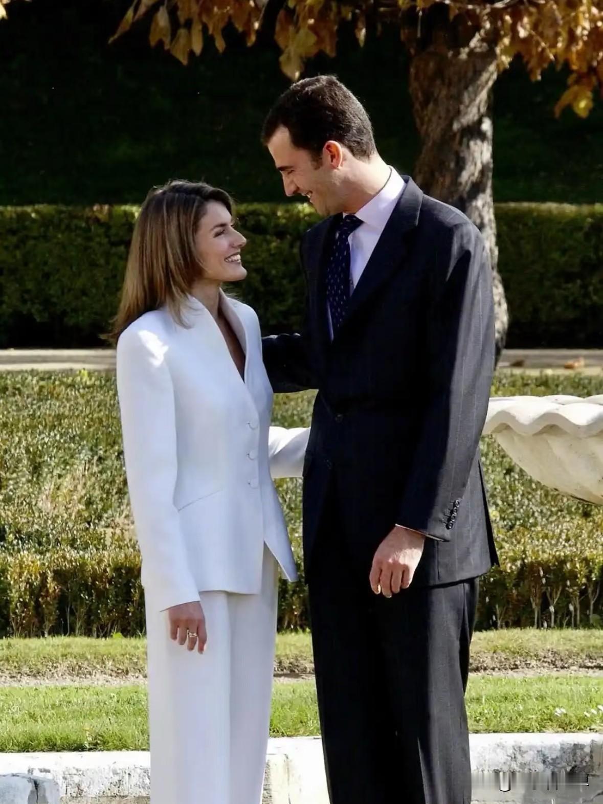 2003年11月6日,马德里帕尔多宫(El Pardo Palace)。西班牙王储费利佩与莱蒂齐亚·奥尔蒂斯在此举行官方订婚仪式。 多张经典订婚照定格了这一时刻。 照片中,莱蒂齐亚身着Armani白色西装套装,利落的立领设计搭配直筒裤,褪去华丽感却尽显优雅; 费利佩则以深色西装搭配淡粉色衬衫,两人牵手微笑,在镜头前默契十足。 另有画面记录下他们在普拉多宫(Prado Palace)花园的合影,阳光洒下时,轻松氛围中透着王室订婚的庄重。