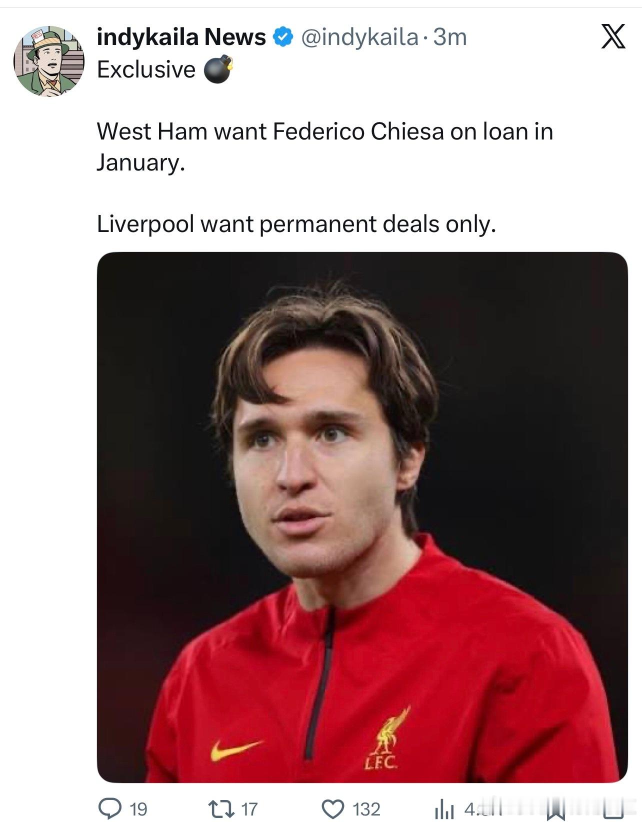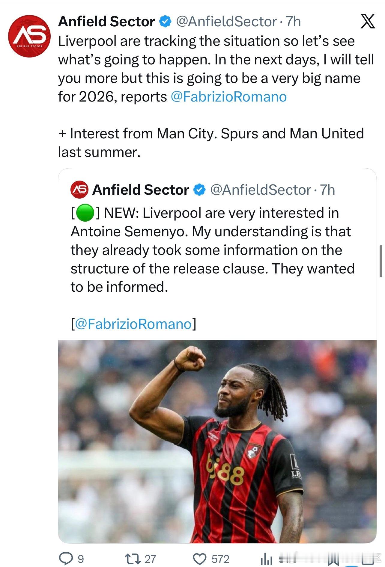 罗哥的两条消息,都和塞梅约有点关系。1.首先就是我军对塞梅约很感兴趣,罗哥了解到的是我军已经了解到一些关于塞梅约解约条款结构的信息了。所以接下来让我们拭目以待会发生什么。2. 基耶萨目前还是想要留在利物浦,但是从现在到一月中要是基耶萨还是没拿到他所期望的出场时间,特别是如果利物浦在冬窗引进另一名锋线比如塞梅约的话,那么基耶萨可能会改变他现有的想法。现在来说的话基耶萨还没有想离开,他想要继续留下为自己的位置所努力。但要是到了明年1月20日,就要看他的出场时间,伤病情况以及塞梅约的转会了,所以基耶萨的情况也是需要关注的。然后绿帽哥说西汉姆联想要在冬窗租借基耶萨,但我军只考虑永久转会。