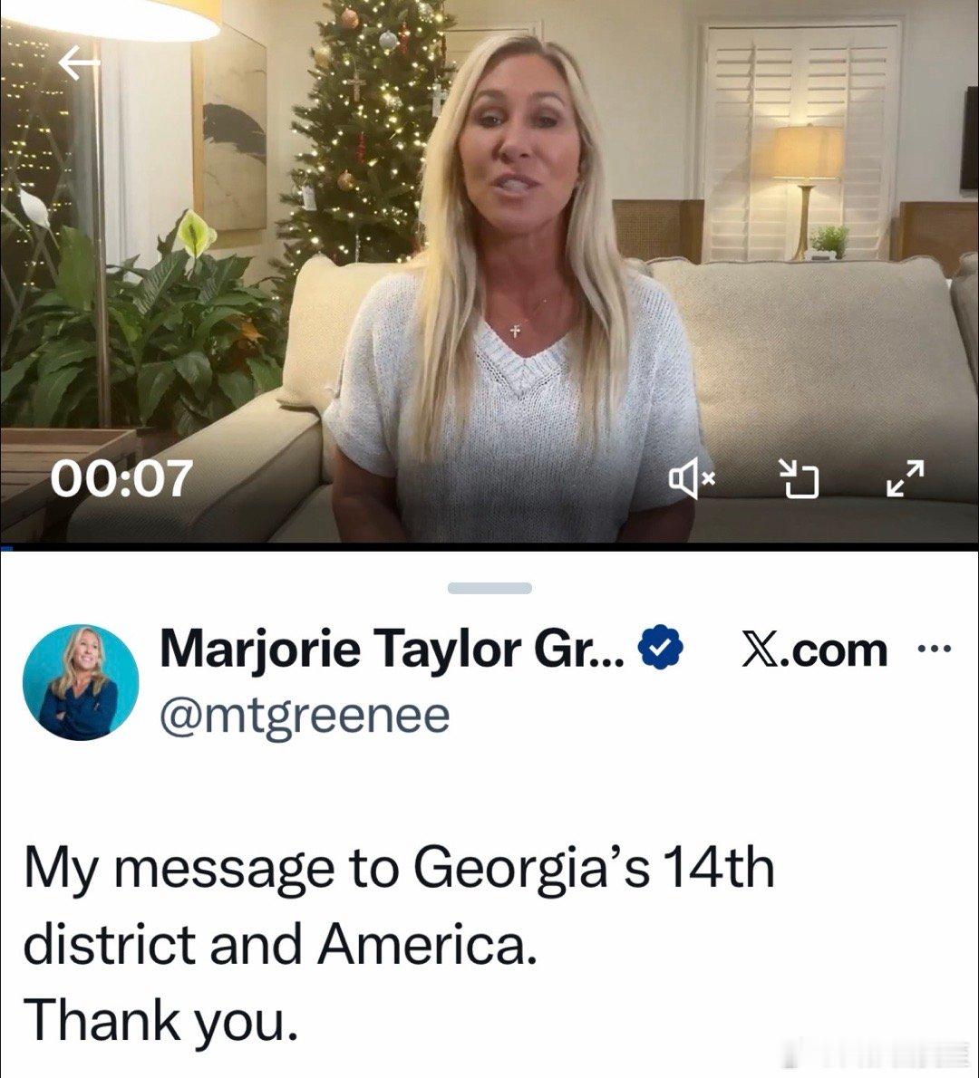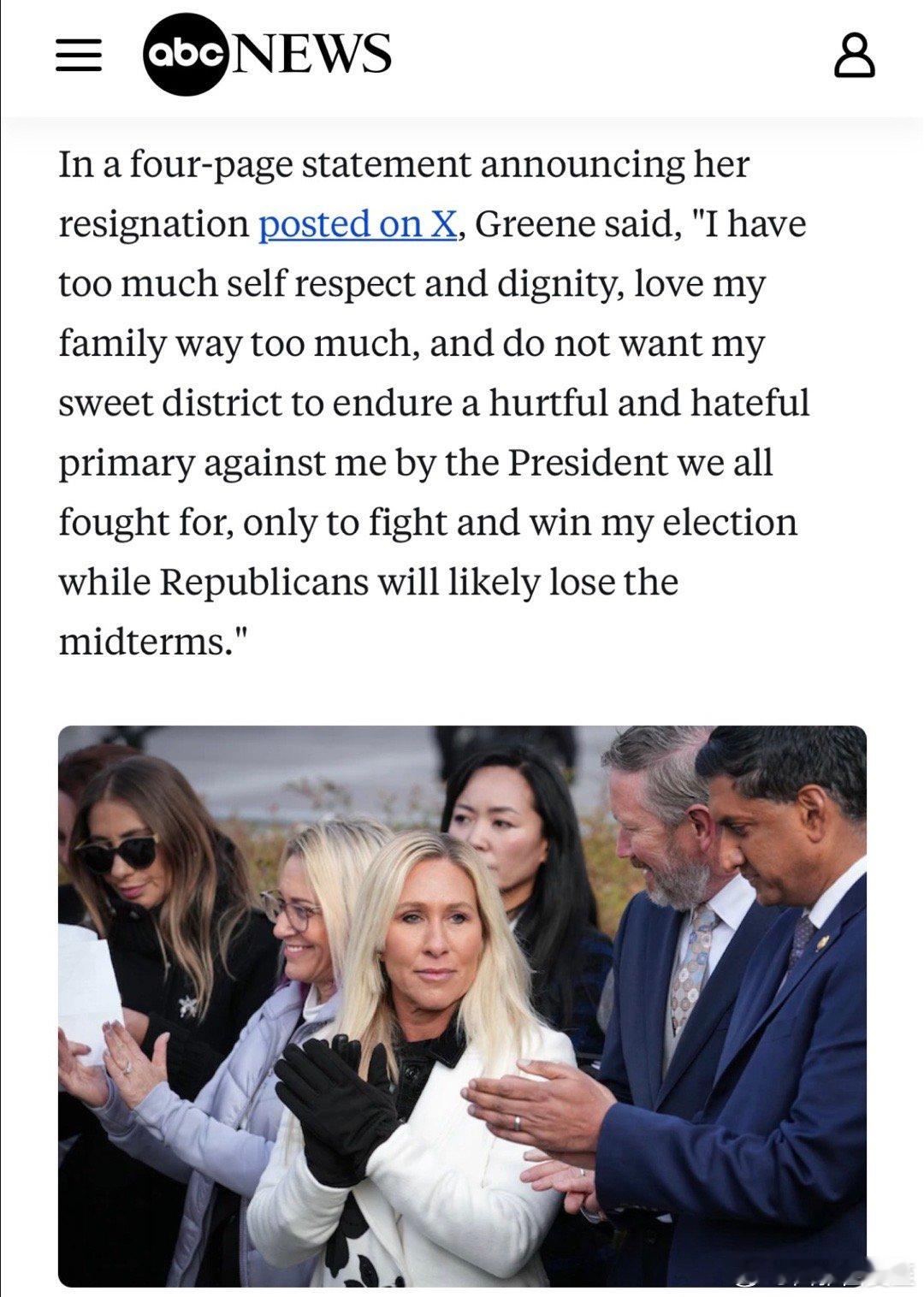 佐治亚州共和党联邦众议员Greene宣布:辞去国会职务,明年一月生效给出的理由:不想让总统在她的选区搞分裂,党内初选阶段充满仇恨,最后她自己能赢、但共和党会输掉中期选举