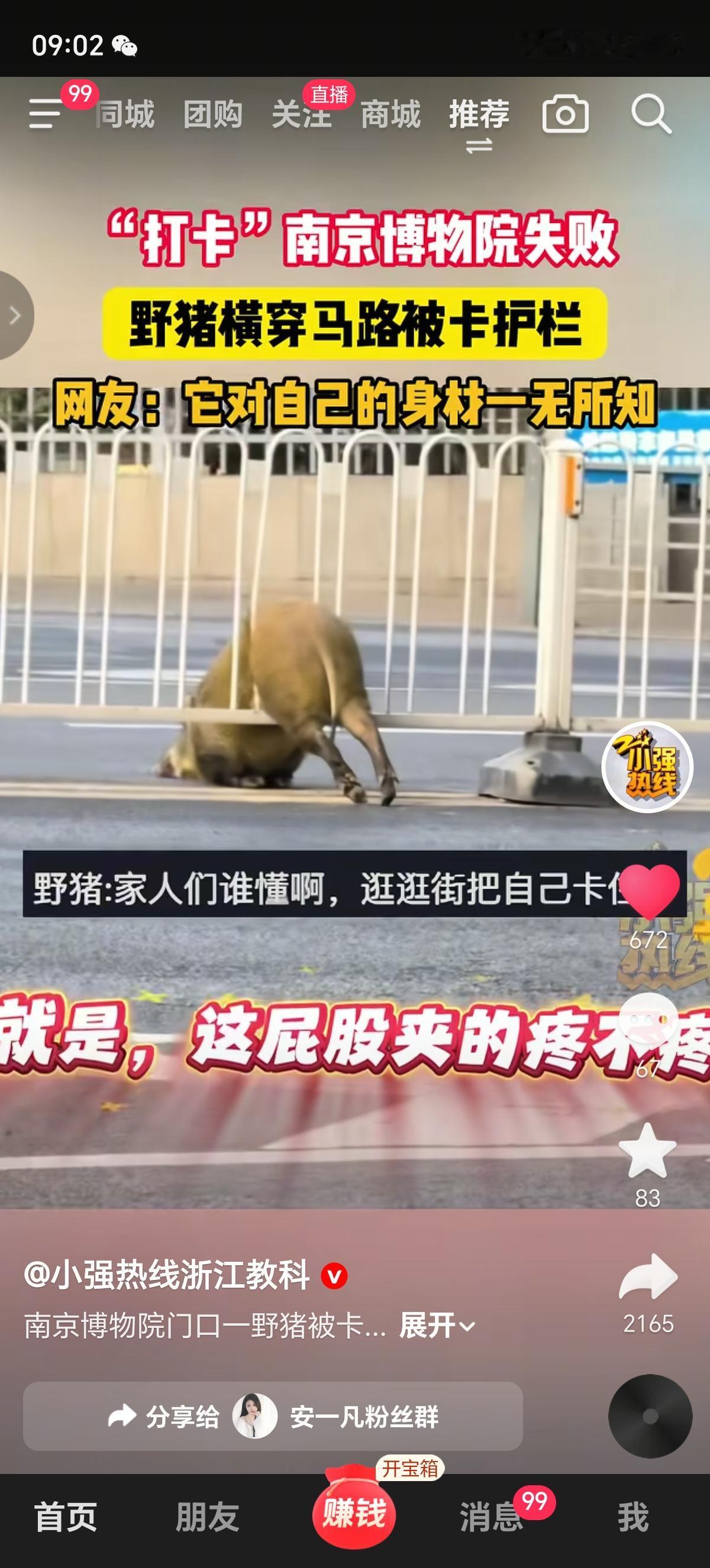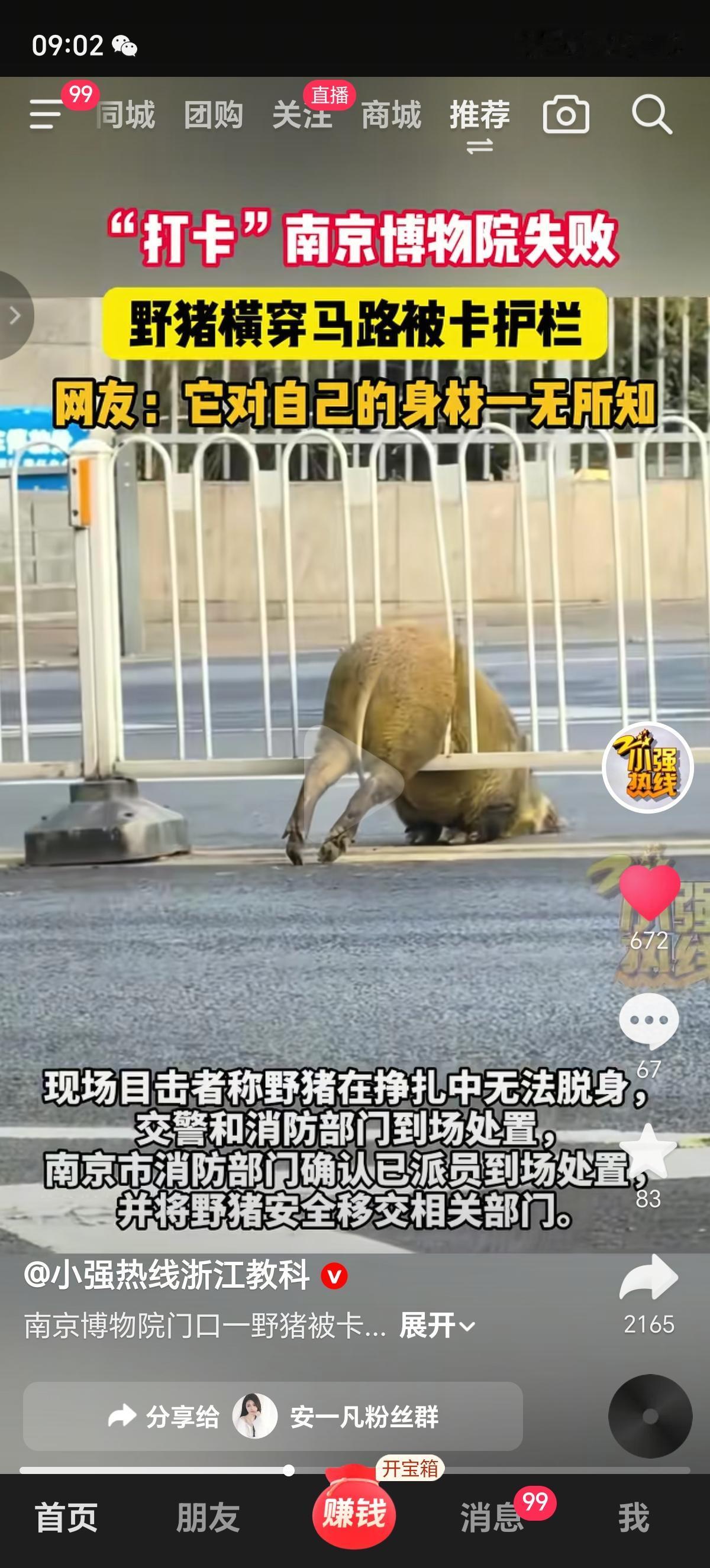 南京的一头野猪火了,想去南京博物院打卡签到蹭文化,可惜它没有提前预约。这个“二师兄”灵机一动,走不了正门走偏门。 可惜它严重错估了自己肥硕的好身材,卡在护栏里了,进也进不去,出也出不来,扭来扭去,单单肥硕得屁股卡在护栏里,动也动不了,只能不断挣扎喊“救命”。 好在这是一只幸运猪,可算等来了消防员叔叔来搭救它,消防员叔叔还怪温柔滴,小心翼翼的用工具扩张护栏间距。努力了半个小时,可下把这只二师兄搭救出来了。还给它弄了个板床,把它成功送回了紫金山深处它的老家去了。 这只去南京博物院“取经”的二师兄给所有它的朋友们提了个醒,下次再去取经先减个肥。