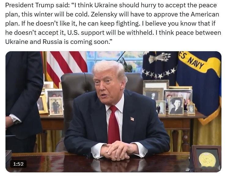 特朗普总统表示:“我认为乌克兰应该尽快接受和平计划,这个冬天会很冷。泽连斯基必须批准美国的计划。如果他不喜欢,他可以继续作战。我相信你们知道,如果他不接受,美国的支持将会被扣留。我认为乌克兰和俄罗斯之间的和平很快就会到来。”