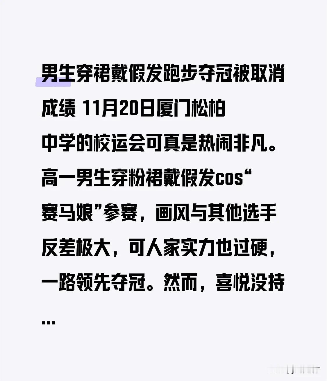 男生穿裙戴假发跑步夺冠被取消成绩11月20日,厦门松柏中学的校运会格外热闹。一