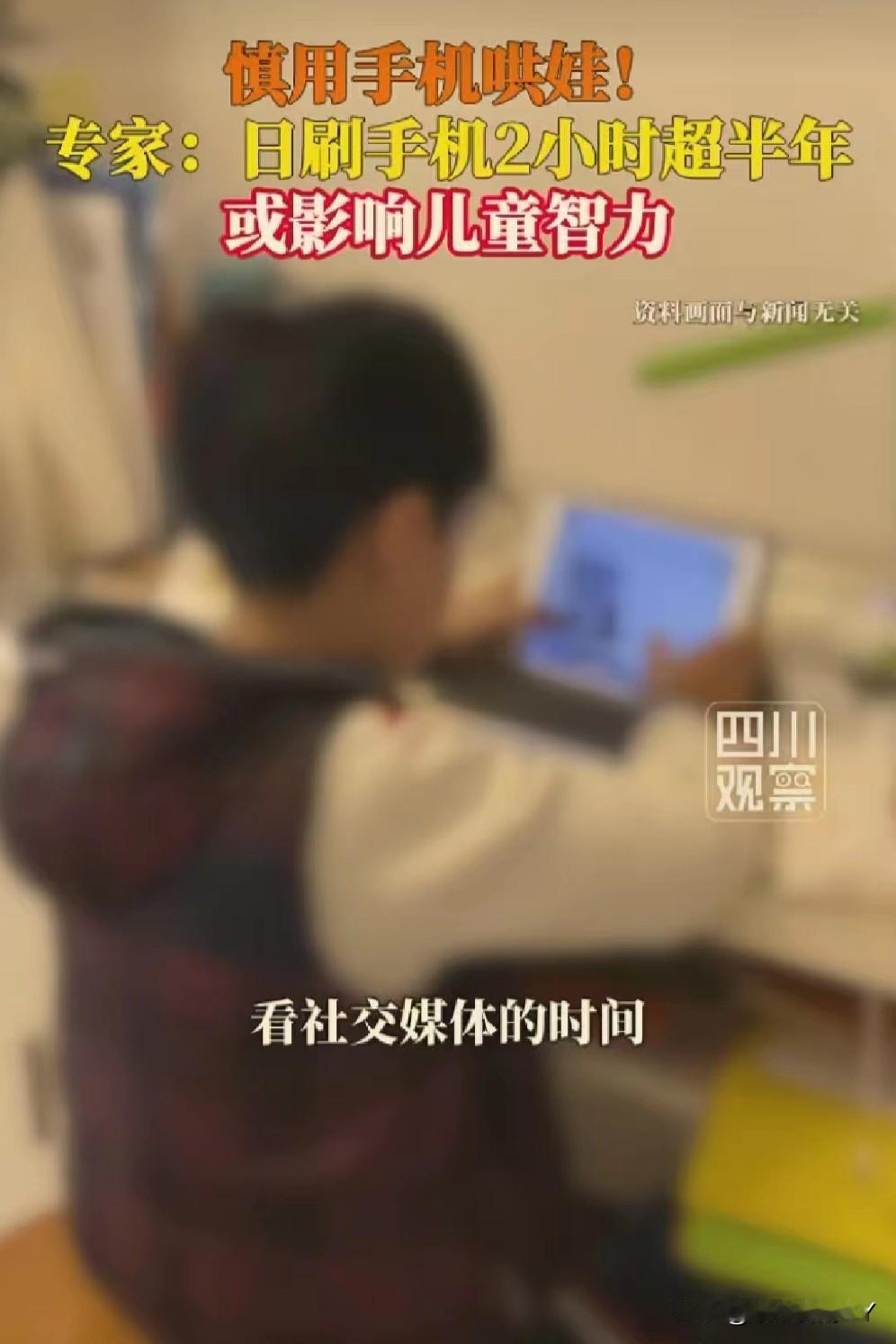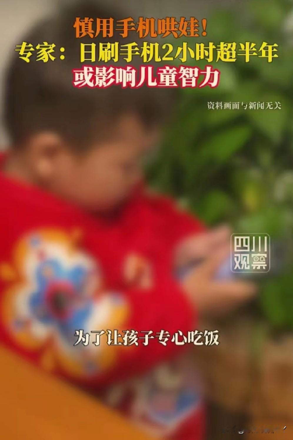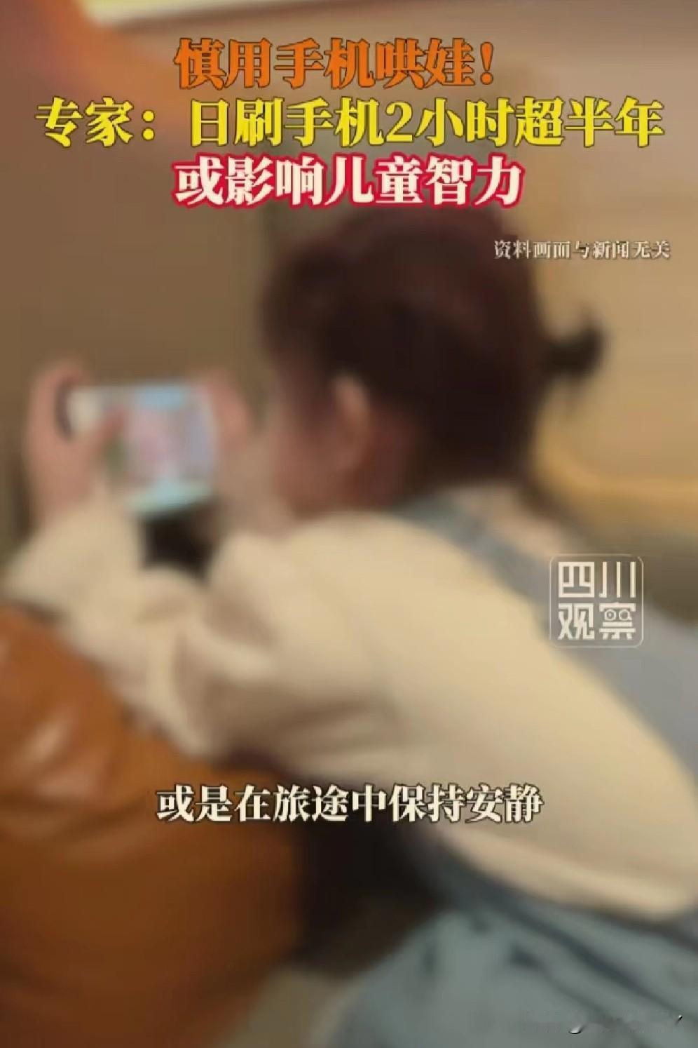 家长注意!别再用手机“哄娃”了! 据四川观察报道,青少年心理专家发出提醒:孩子每天刷手机超过2小时、且持续半年,可能会对智力发育造成影响! 不少家长为了让孩子乖乖吃饭、在旅途中保持安静,便把手机当作“安抚神器”给孩子玩,可别为了让因一时省心,而耽误了孩子成长啊~