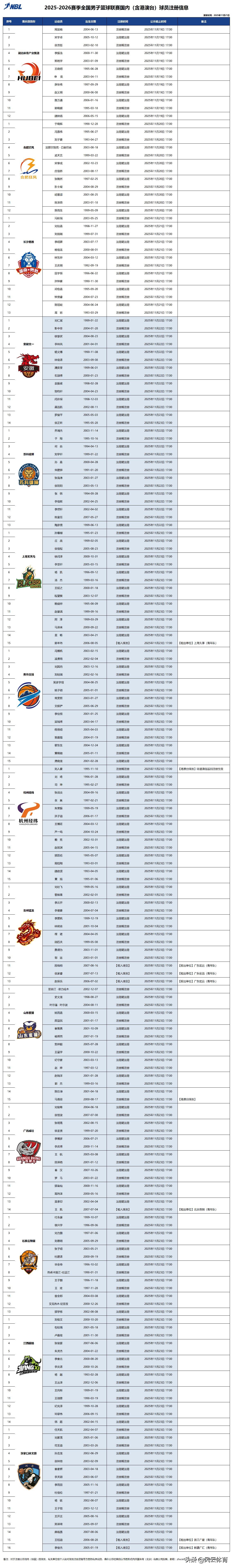 新增6队!2025NBL联赛参赛球队名单出炉! 北京时间11月22日,2025-26赛季全国男子篮球联赛(NBL联赛)国内球员注册日截止。参加新赛季NBL联赛的球队由上赛季的8支增加到如今15支。其中安徽文一和河南焦作文投为退赛一年后重新加盟。而上海玄天鸟、山东蜜獾、杭州经纬、贵州猛龙、张家口体文旅为新增球队! 至此,2025-26赛季NBL联赛参赛球队分别为:安徽文一皖江龙、合肥狂风、广西威壮、湖南勇胜、湖北体产、焦作文投、石家庄翔蓝、张家口体文旅、杭州经纬、山东蜜獾、贵州猛龙、上海玄天鸟、江苏苏科雄狮、江西赣驰、香港金牛(特邀球队) 目前各支球队国内球员已经全部注册完毕,其中不少球队进行针对性补强,如湖南勇胜引进了前CBA球员许钟豪、王庆明等,湖北体产引进了前CBA球员郭晓鹏等。
