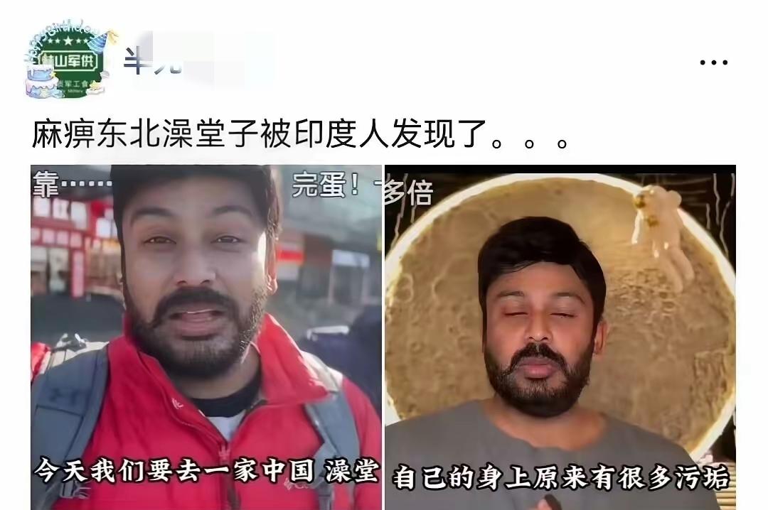 东北的大澡堂也被印度人发现了,两位印度博主像进了大观园一样,免费的东西挨个试了遍,赞叹不已,相比他们的澡堂子恒河,这里犹如天堂一般,让他们欲罢不能。只是,东北的兄弟们好像不太高兴了,骂骂咧咧的,以后还怎么愉快的进澡堂子!
