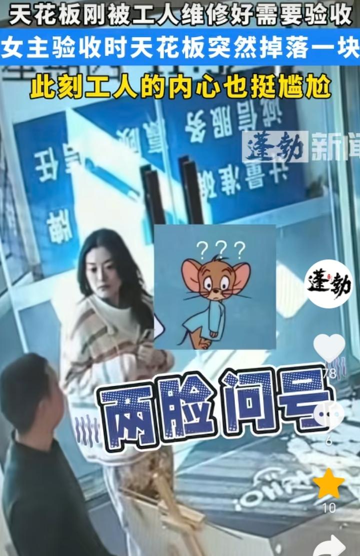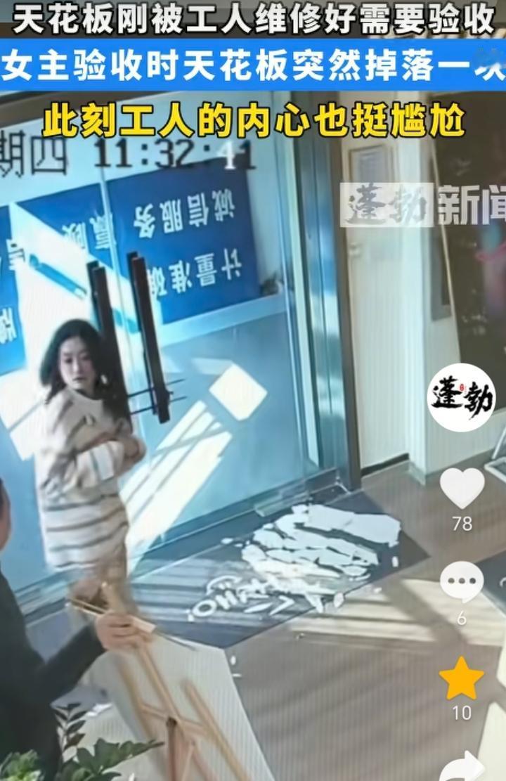 “当场打脸”!北京,女子请来师傅维修天花板,结果师傅维修好让女子验收,女子发现天花板上面有裂缝,于是就询问师傅干了后会不会掉下来,话刚说完天花板突然就掉了一块下来,女子面向师傅一脸的疑问,师傅也是被当场打脸,估计师傅当时都想找一个地缝钻进去了。 女子运气也是太好了,验收的时候正好天花板掉了下来,好在没有被砸中,如果当时验收的时候没有掉下来把钱给师傅付了,事后在掉下来那就说不清了,女子这运气可以去买彩票了,说不定还能中一个大奖。 从这件事也可以看出,这师傅就是一个不负责任的人,明显就是为了糊弄女子简单维修了下,结果没想到被当场打脸了。 没有那个金刚钻就不要揽瓷器活,既然给干那就应该给干好,被打脸了滋味肯定也是不好受。
