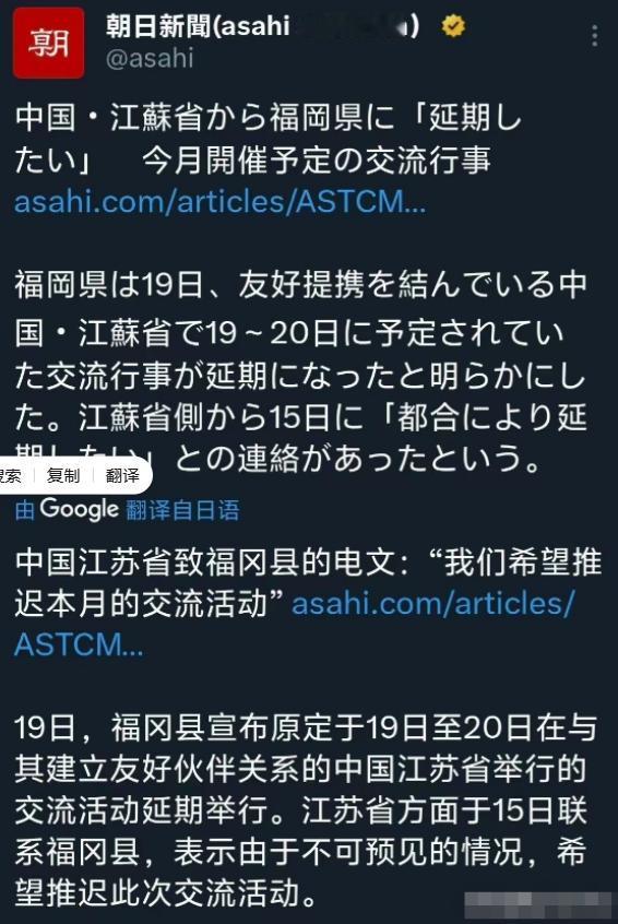 中日之间已经没有“友好”关系了?日本福冈县宣布,中国江苏省向日本福冈县通报,由于不可预见的原因,推迟原定于11月19日至11月20在江苏省举办的交流活动。 江苏和福冈县一直是友好省县,过去经济和文化交流不断。但是日本这几年在敏感问题上不断给中国添堵,比如和美国一起在芯片技术和高科技上设障,背地里不断挑战中国底线。 这种做法说白了就是一边想要中国市场的好处,一边还时不时耍些“不太厚道”的动作。换个角度想,谁愿意和这么双面的人长期合作?表面说着友好,实际却在暗地里划清界线,这种关系本身就不牢靠。 很多人可能觉得,一个活动延期没什么大不了。但在两国长期往来中,这类“风吹草动”恰恰说明信任已经摇摇欲坠。 明明双方都知道交流要靠互相尊重,日本一边管控科技出口,一边还是想让中国买车、买电子产品,这种只想着自己方便的做法,迟早会出问题。 中国这次没直接断交,而是选择了推迟,实际上也是在给对方释放信号。要继续合作就得守规矩,不能一面想合作一面又搞事情。 这次延期,日方的反应更是让人无语。磋商没谈明白,反过来对着中方说什么“媒体拍摄影响舆论”,但其实现场记者多是日本人。 这点小动作不仅不解决根本问题,反而让人觉得日方底气不足,眼看说不过人家就只会变着法给对方扣帽子。这种姿态,其实已经说明中日关系在真实层面离“友好”有了不小距离。 民间一直有人强调,政治归政治,民间交流归民间交流。但这次江苏省官方的态度很明确,合作要有底线,如果政治上互信都谈不拢,还指望民间交流顺利进行吗? 老百姓的心都是雪亮的,谁一次次让人失望,谁又能指望大家长期“热脸贴冷屁股”地往来?这样的结果,其实顺应了民众的真实感受,不可能还让官方去演一个大家都不信的“友好”剧目。 这次推迟不是临时起意,而是日本这样的做法长期积累的后果。如果真的想恢复过去的友好,日方就得拿出诚意,不要一边享受中国市场,一边在关键利益上动心思。 只要日本还把“友好”当成单方面收获的手段,这种合作迟早变成空中楼阁,遇到一点风就散了。 未来两国关系肯定还是会经历争议和摩擦,但是中日之间未必只剩下敌对,合作空间还在,只是需要重新回到相互平等和坦诚交流的基础上。 大家别再对“友好”抱有幻想,合作得有底线和规矩,否则就只能各走各的,再也谈不上共赢。