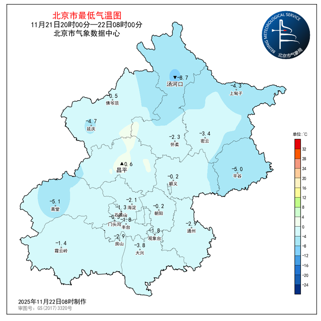 24日夜间:晴;偏北风2、3级;平原地区最低气温-3℃,山区最低气温-8~-5℃。