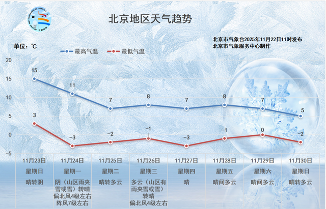24日(周一)白天:阴(山区有雨夹雪或雪)转晴;偏北风4级左右,阵风7级左右;平原地区最高气温11℃,山区最高气温6~11℃。