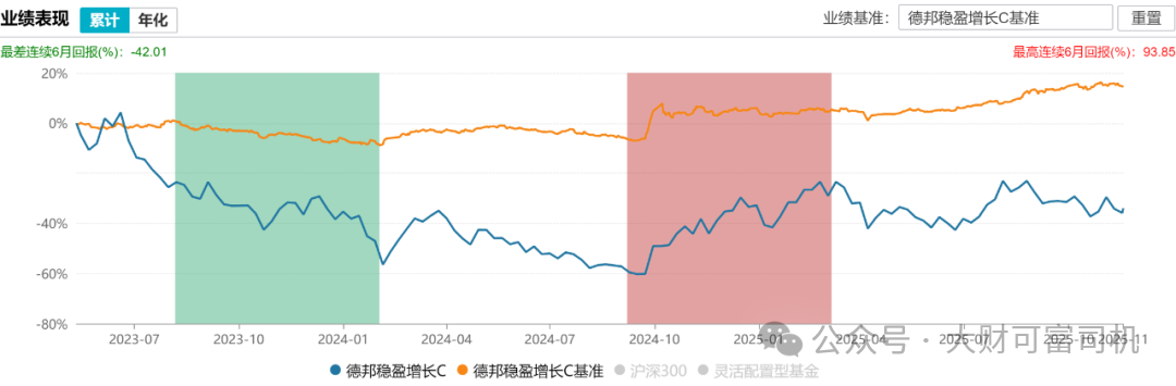 可实际上呢?司机在《牛市来了,没想到最先塌房的是他!》文章里写过,雷涛管理的德邦稳盈增长C,自2023年5月接手以来,截至11月18日,任职总回报-34%,年化回报-15.15%,在2119只同类基金里排2107名,妥妥的“垫底选手”。今年以来最大回撤近30%,业绩比较基准涨8.59%,沪深300涨了16.09%,他管理的基金收益只有2.28%,“稳盈”直接变“稳输”。