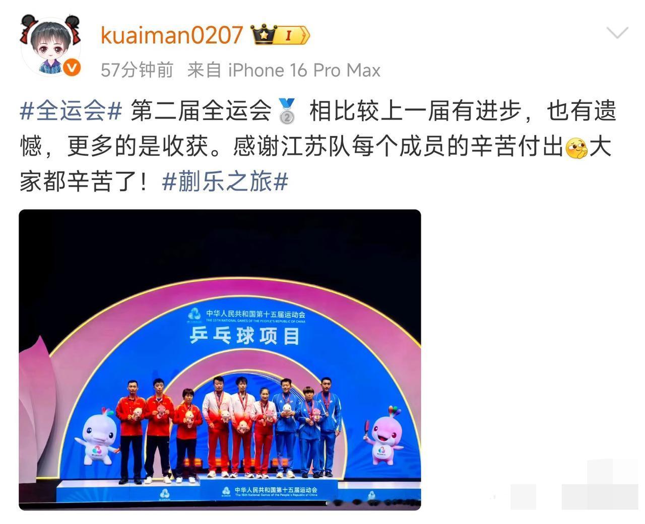 蒯曼感慨总结全运会:第二次全运会🥈, 相比上一届有进步, 也有遗憾, 更多的是收获, 感谢江苏队每一个人的精彩付出, 大家都辛苦啦! 还等着蒯曼晒出自己喜欢的美食呢! 没心情了吗? 蒯曼/陈垣宇的混双2:3 林高远/刘诗雯, 对于蒯曼来说的确很遗憾, 大比分2:0领先, 被广东队连扳三局, 与混双冠军擦肩而过, 失之交臂, 令人太遗憾! 比赛还很多, 成都混团即将开始, 蒯曼加油!