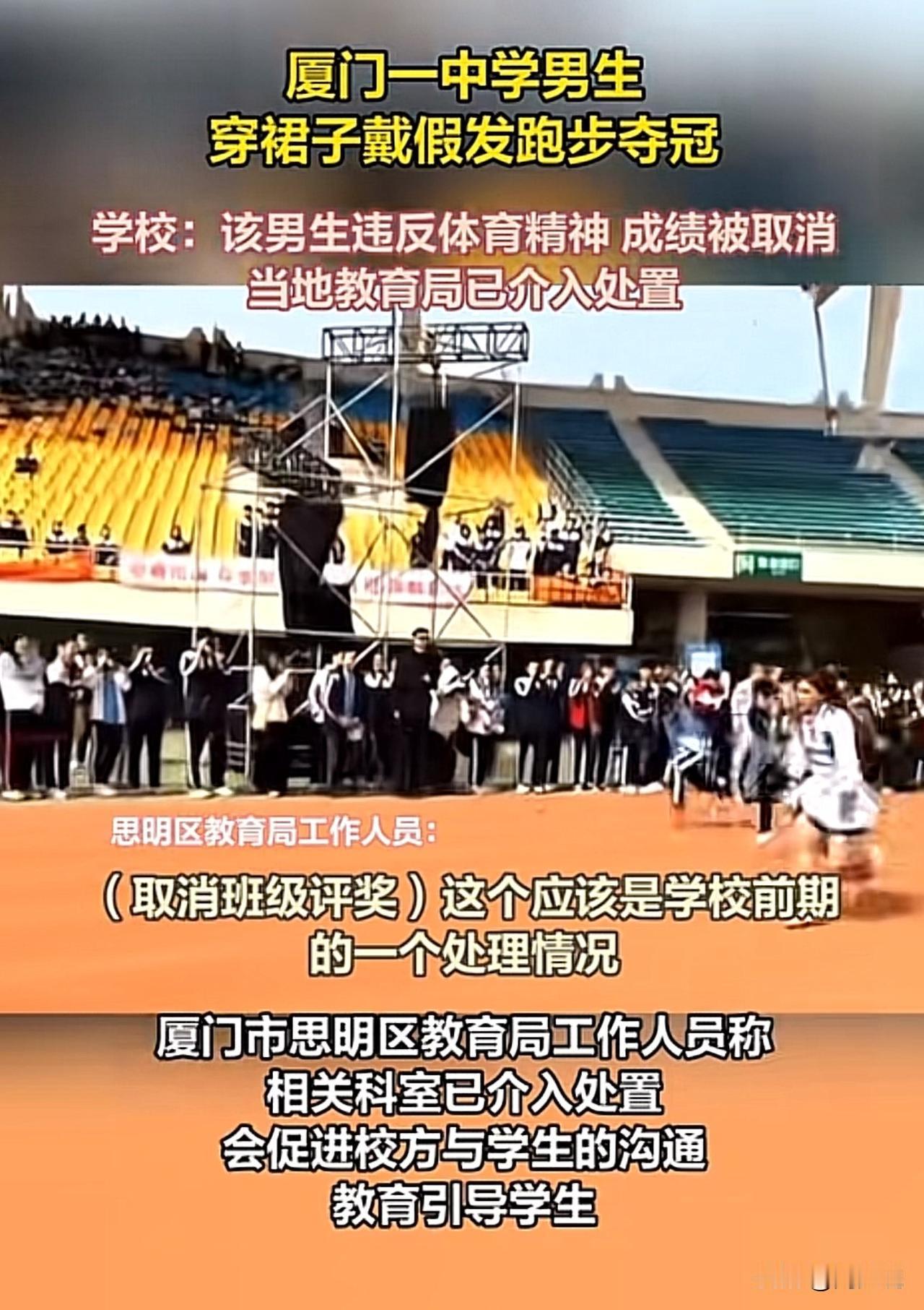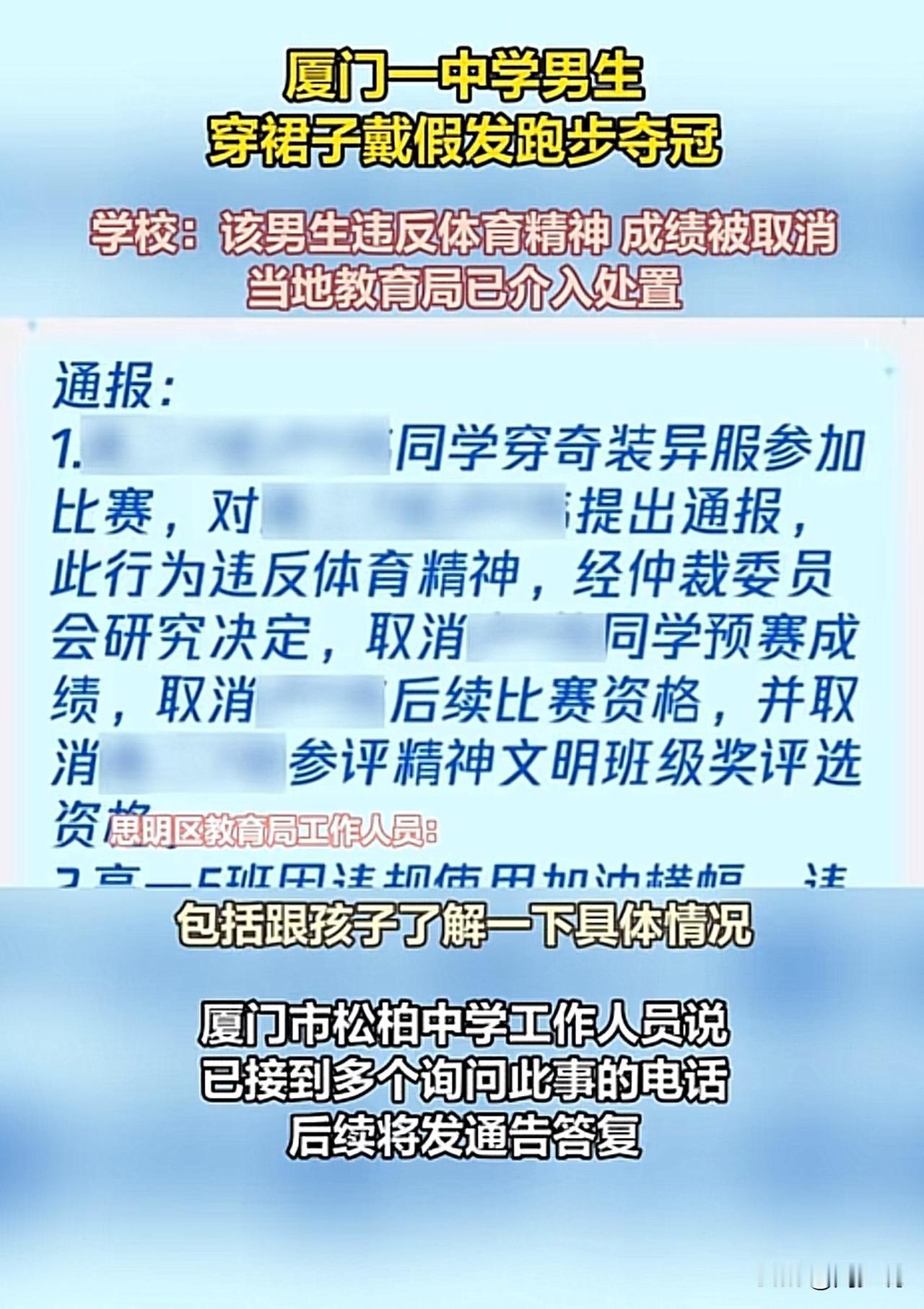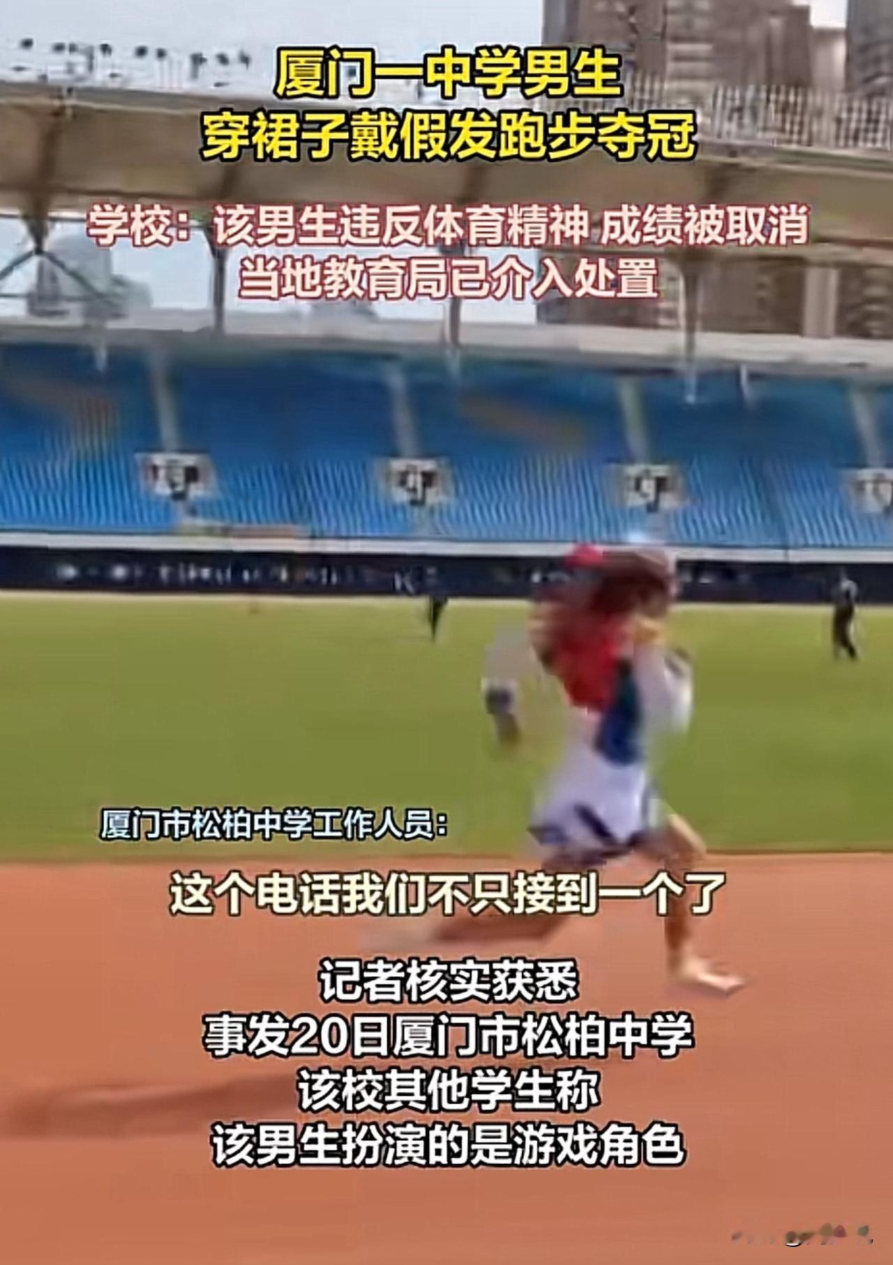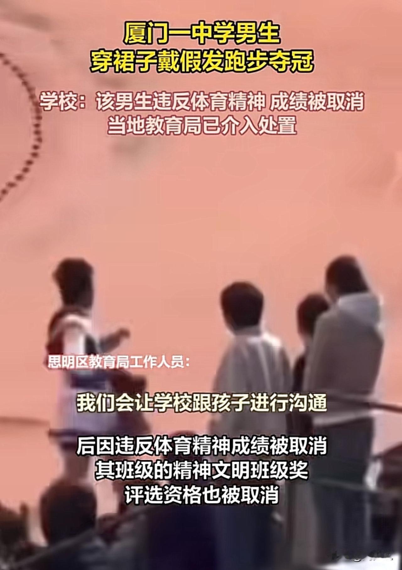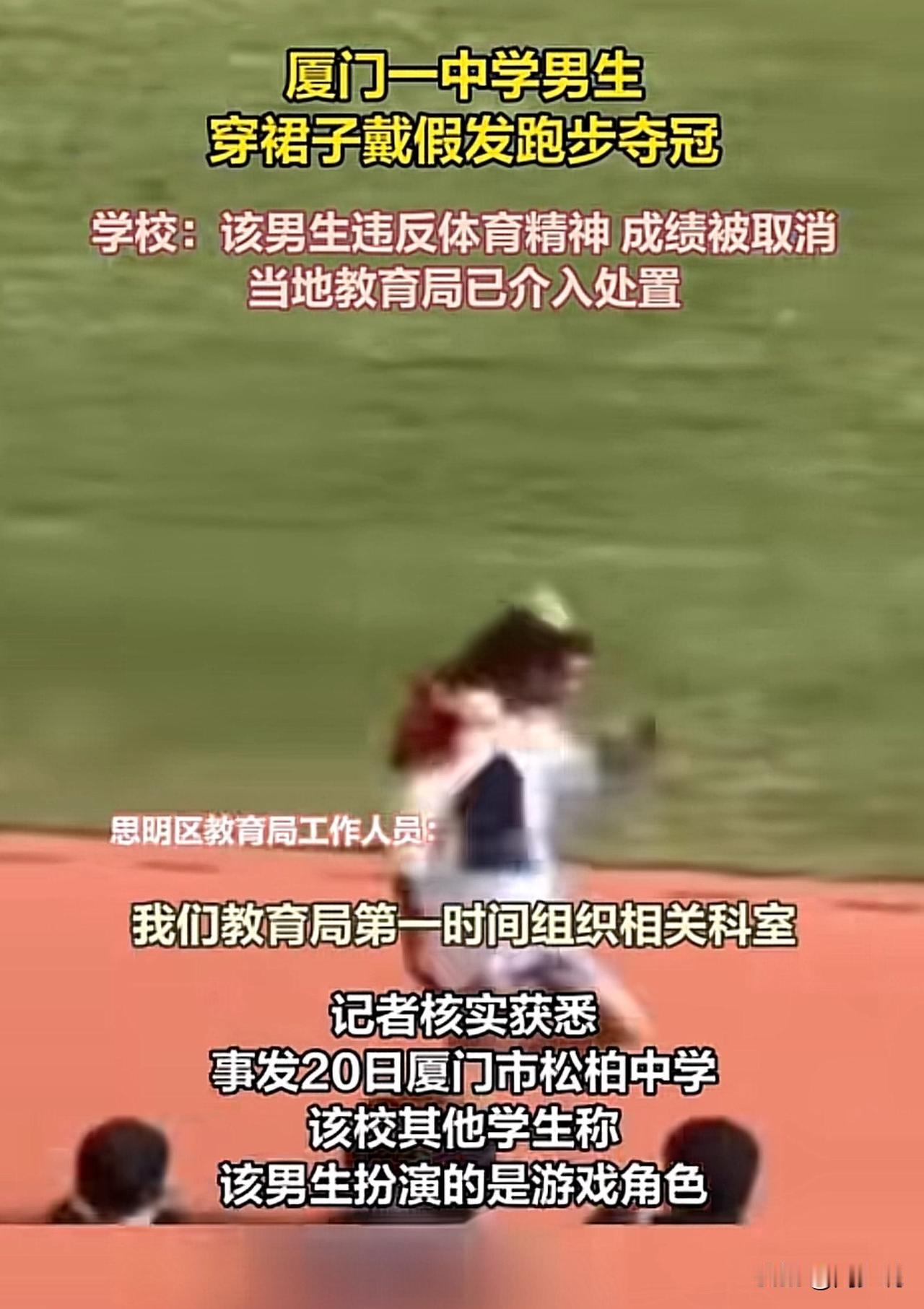 #男生穿裙戴假发跑步夺冠被取消成绩#“厦门一男生穿裙戴假发夺冠被取消成绩火上热搜!”近日,松柏中学一名男生穿粉裙、戴金发假发cos游戏角色参赛,赛道上大幅领先轻松夺冠,冲线时摘下假发的画面引爆全场。 可谁料,赛后学校直接以“违反体育精神”取消其成绩,连班级的精神文明奖也被连带撤销。 此事迅速发酵,网友吵成两派:有网友力挺“青春就该有个性,凭实力夺冠没作弊,凭啥取消?” 也有网友支持校方“体育比赛要讲公平严肃,奇装异服可能干扰秩序”。 目前学校回应将发通告详细说明,思明区教育局已介入协调沟通。看完这事,周少认为其实这场争议的核心,是青春个性与校园规则的碰撞。 校运会不该只有冰冷的规则,也该包容年轻人的创意活力,但个性表达也需守住场合边界。既希望学校能明确规则、精准处罚,也别让一次创意尝试,浇灭了学生的鲜活热情。 对于这位男生穿裙戴假发跑步夺冠被取消成绩,大家怎么看呢?#寻美三湘# #长沙新朋友#