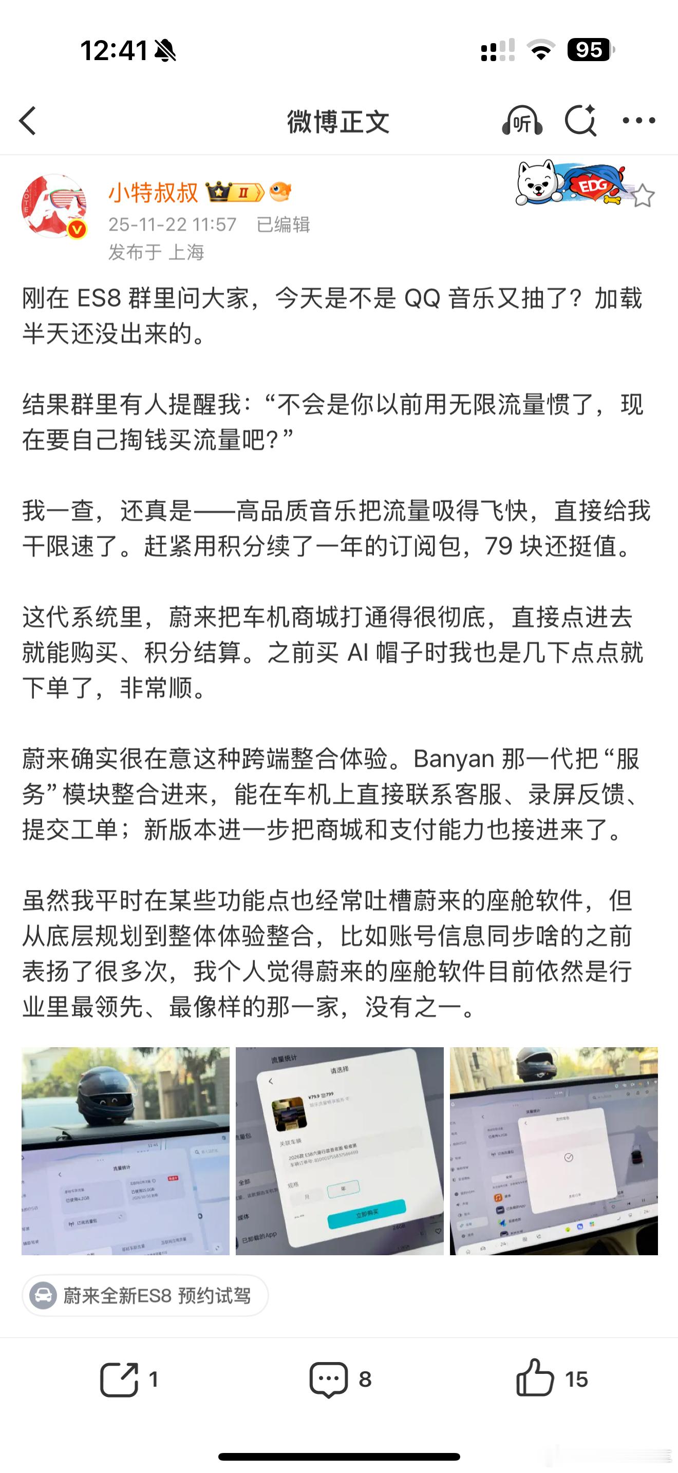 借 特叔这个还可以多分享两句。蔚来把车机和车商城、换电、换电呼叫、App、账号体系,反正能打通的基本都打通了。以前大家都喜欢说 生态 到了蔚来这里似乎有点不愿意提,但事实上,生态不止是说 类似谷歌、百度、阿里、华为 这样多元业务整合。具体到 用户体验上,打通自家所有服务环节,简化用户过多的操作流程,这是内在生态,也是 服务 的重要特质。就说个看起来最最最简单的,车机账号体系 nio 做的应该是 最好用。不同用户解锁后直接无感切换,所有用户功能都能记忆到这个账号下。