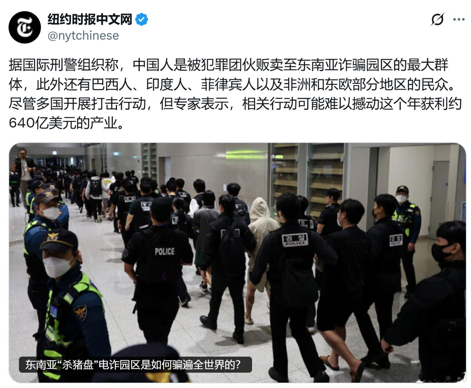 纽约时报:据国际刑警组织称,中国人是被犯罪团伙贩卖至东南亚诈骗园区的最大群体,此外还有巴西人、印度人、菲律宾人以及非洲和东欧部分地区的民众。尽管多国开展打击行动,但专家表示,相关行动可能难以撼动这个年获利约640亿美元的产业。这些人根本不是什么诈骗分子,它们是恐怖分子,能让它们在离中国近在咫尺的地方肆无忌惮的诈骗和杀害中国人这么多年,而且至今没有清除干净,是我们的耻辱!
