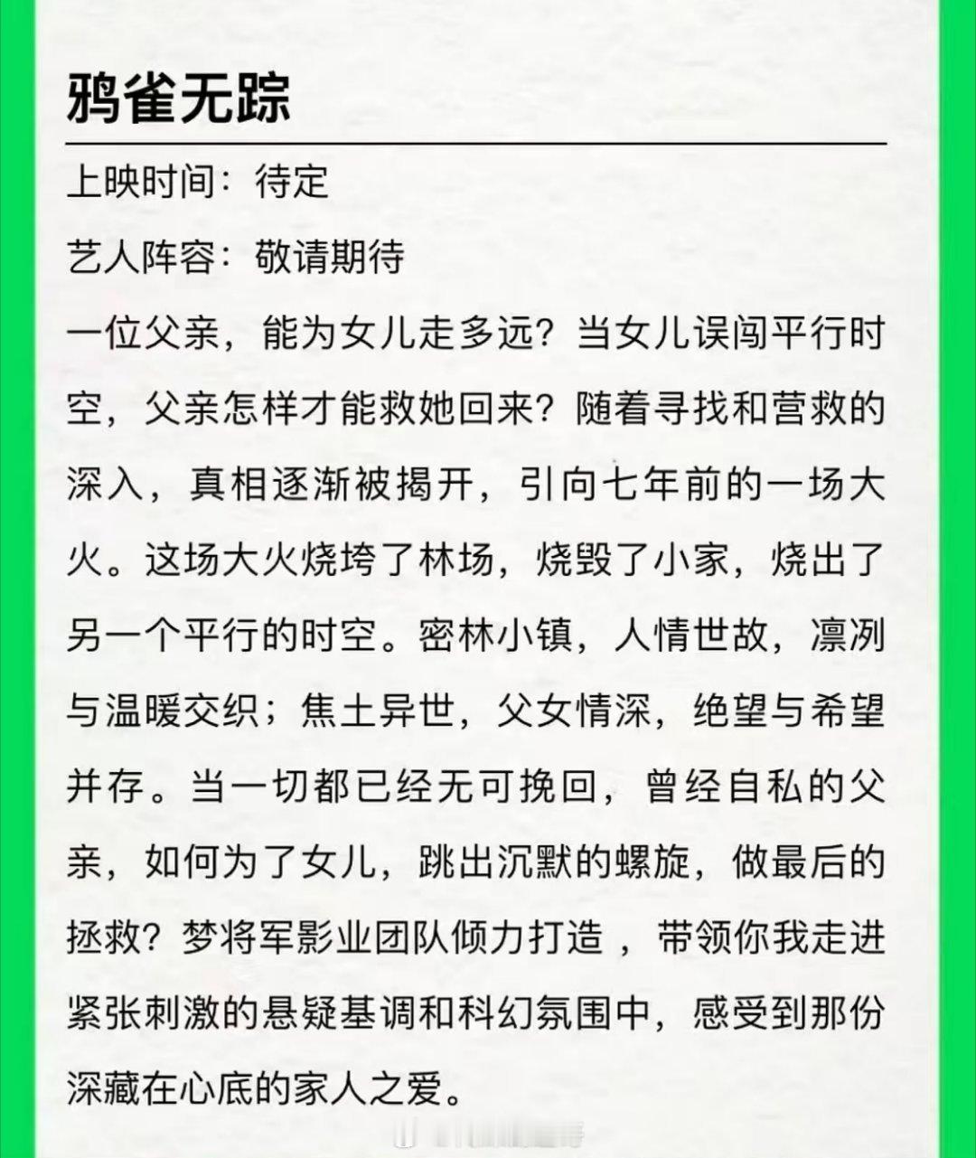 《鸦雀无踪》张译、宋祖儿一位父亲,能为女儿走多远?当女儿误闯平行时空,父亲怎样才能救她回来?随着寻找和营救的深入,真相逐渐被揭开,引向七年前的一场大火。这场大火烧垮了林场,烧毁了小家,烧出了另一个平行的时空。密林小镇,人情世故,凛冽与温暖交织;焦土异世,父女情深,绝望与希望并存。当一切都已经无可挽回,曾经自私的父亲,如何为了女儿,跳出沉默的螺旋,做最后的拯救?梦将军影业团队倾力打造,带领你我走进紧张刺激的悬疑基调和科幻氛围中,感受到那份深藏在心底的家人之爱。