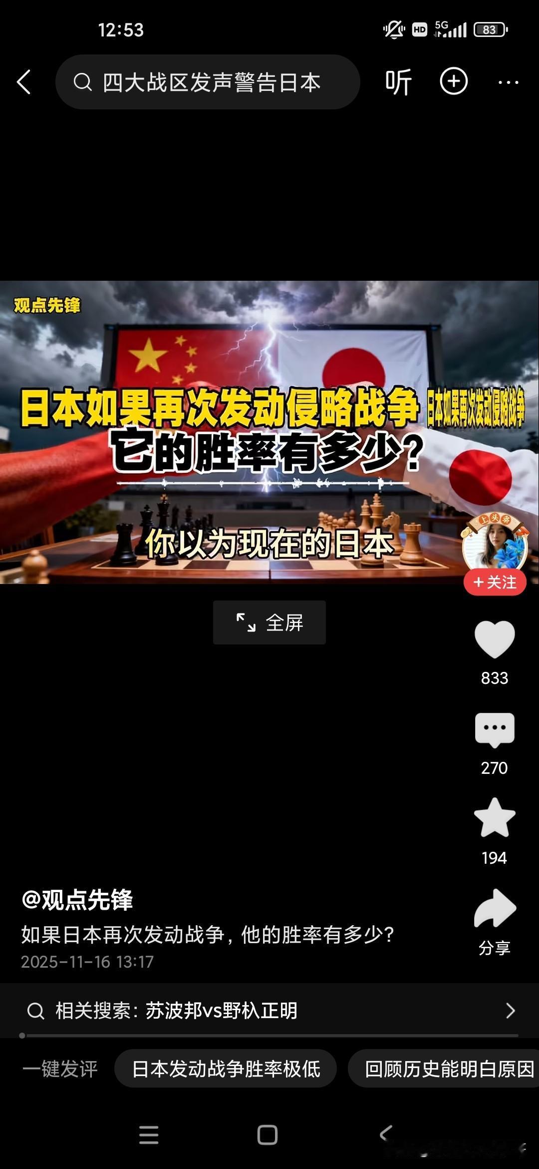 日本自卫队的微博账号直接开始挑衅我们中国人民解放军,上面说,自卫队武器已经准备好了,战争已经准备好了,所有可能遇到的问题和解决办法都已经准备好了,总而言之一句话,一切都准备好了!这挑衅中国的意味已经昭然若揭,一直以来,因为在日本有美国的驻军,他们一直想拉美国下水,希望美国为他们出头儿,所以说在特朗普访问日本的时候高市早苗才那么谄媚,而且主动提出可以为美军基地提供5000亿美元的军事支援,不仅是为他们提供基地,还为他们提供武器,还帮他们解解决其他一切的生活和工作方面的问题,所以说日本是一个非常喜欢冒险的国家,他就喜欢赌,之前偷袭过沙俄,偷袭过珍珠港,也偷袭过北洋舰队,这一次不知道会不会偷袭中国大陆,如果这一次他真敢的话,我觉得我们已经70多年没打仗了,极有可能会把日本当成一个最好的练靶试验场,到时候日本可别后悔,因为你没有把他打服过,所以说从来不服气你,总是喜欢挑衅你,他就是一个欺软怕硬的国家!